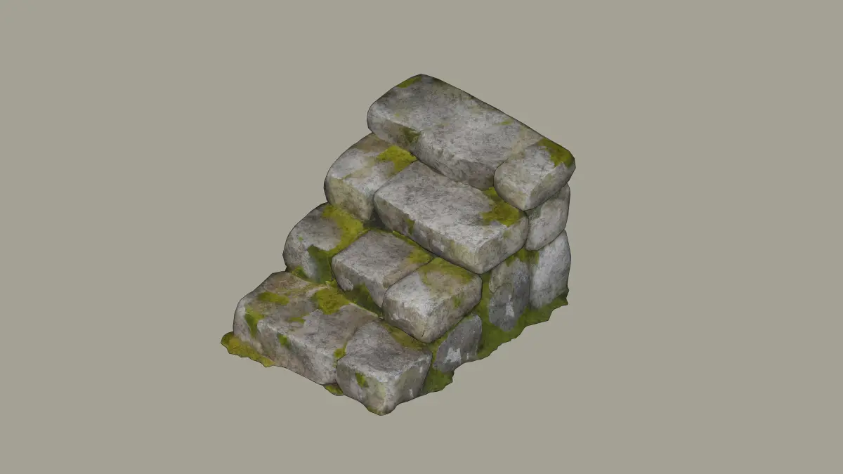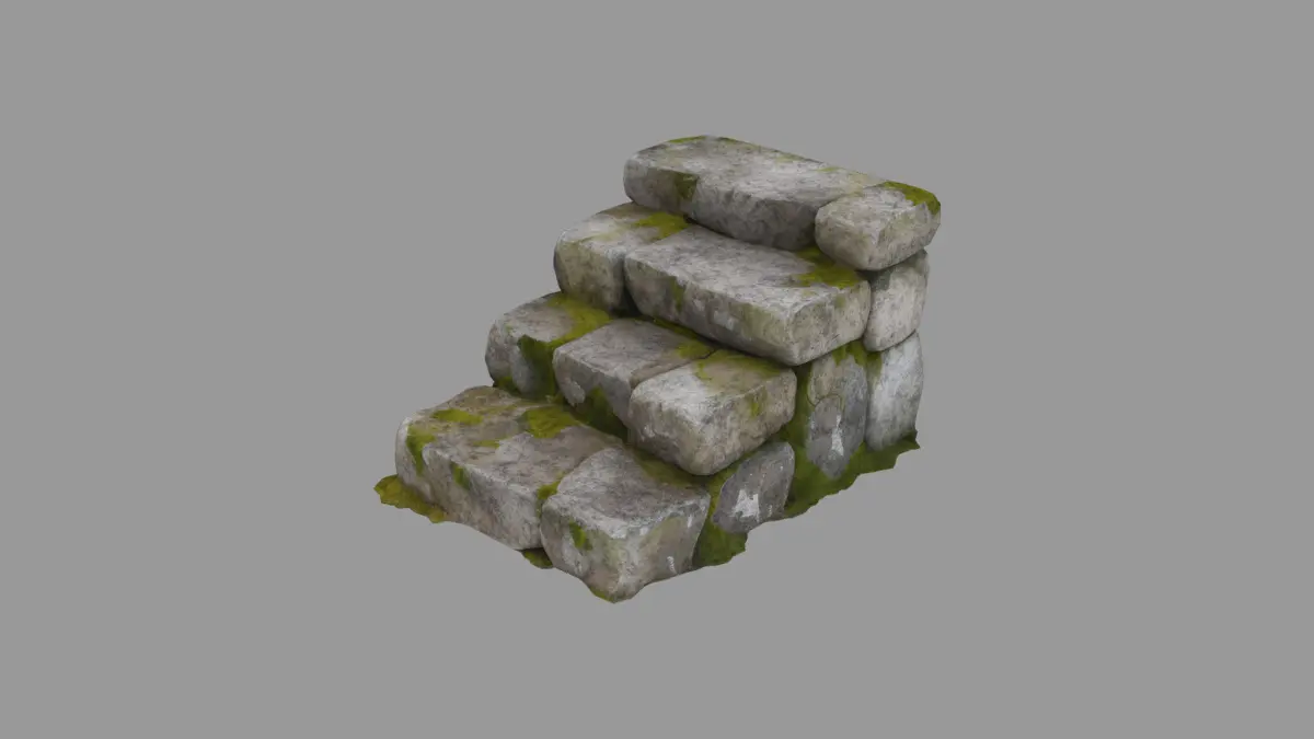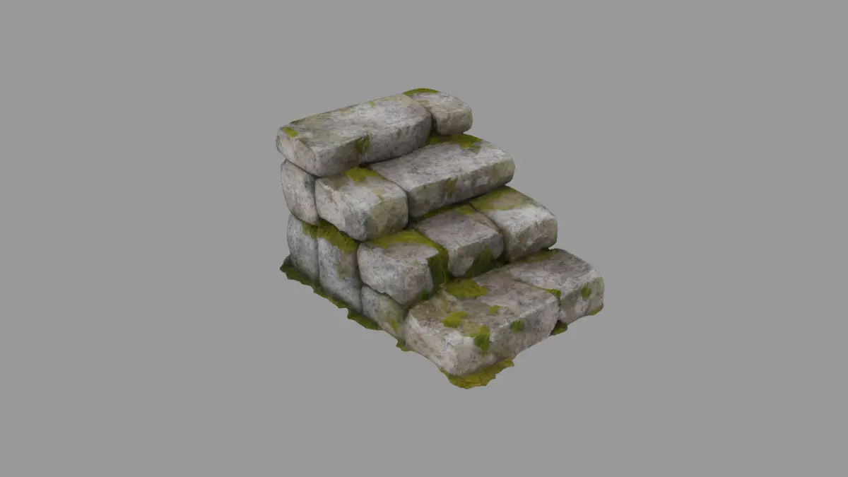 This 3D low-poly model features a set of ancient stone stairs, characterized by large, moss-covered blocks. The weathered texture and irregular shapes give it a historical, decayed appearance, making it ideal for fantasy or medieval game settings, architectural visualizations, or animations. Its natural gray tones and rugged design add a sense of authenticity to any scene.