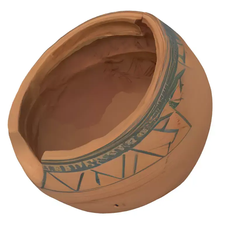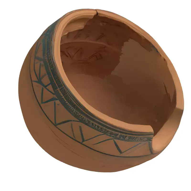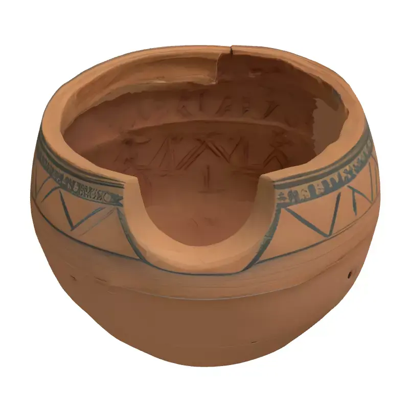 This meticulously crafted 3D model presents an ancient terracotta vessel, characterized by its distinctive rounded form and intricate geometric patterns etched or painted around its exterior and interior rim. The design, reminiscent of historical artifacts, features a unique cut-out or spout section on the rim, suggesting a specialized function, possibly for ritualistic ceremonies, pouring liquids, or storage. This high-fidelity model is ideally suited for a wide array of digital applications, including enriching game environments with historical or fantasy themes, populating museum-grade architectural visualizations, and serving as an authentic prop in film, animation, or augmented/virtual reality experiences. The model boasts clean, optimized topology, ensuring smooth performance in real-time applications while retaining exquisite detail for high-resolution static renderings. It is fully UV unwrapped with professionally crafted PBR (Physically Based Rendering) textures, guaranteeing realistic material representation under various lighting conditions. Available in multiple industry-standard formats such as GLB, OBJ, STL, ABC, DAE, FBX, USD, and PLY, this asset provides maximum compatibility and ease of integration into any 3D pipeline. Its realistic textures and precise geometry make it an invaluable addition for historical reconstructions, educational projects, or as a unique decorative element in digital art scenes.