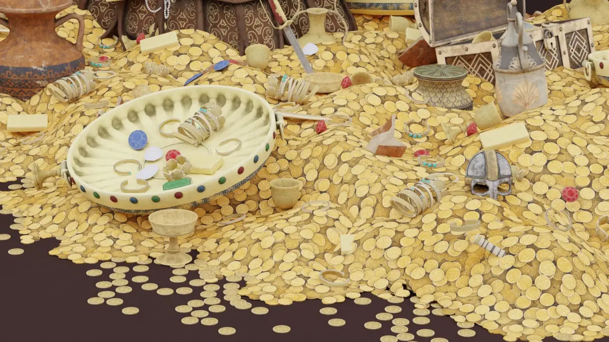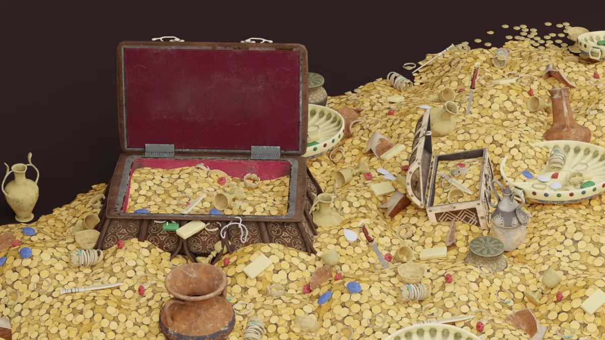 Ancient Treasure 3D ModelAn evocative Ancient Treasure model featuring a partially buried, weathered chest spilling over with glittering coins, mysterious artifacts, and jewel-encrusted relics. The chest lid is slightly ajar, revealing intricately detailed objects such as golden statuettes and ancient amulets. Textures are rendered in 4K, capturing the tarnish of aged metal, the cracks in weathered wood, and the brilliance of scattered gemstones. Available in Blend, FBX, OBJ, and DAE formats, this model is perfect for treasure hunt scenes, historical adventures, or fantasy storytelling.