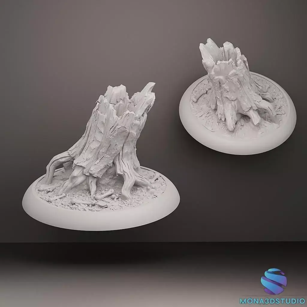 Enhance your tabletop experience with this highly detailed ancient tree stump. Featuring realistic bark textures and gnarled roots intertwined with scattered bones, this terrain piece is a must-have for dark fantasy, swamp, or cursed forest settings.