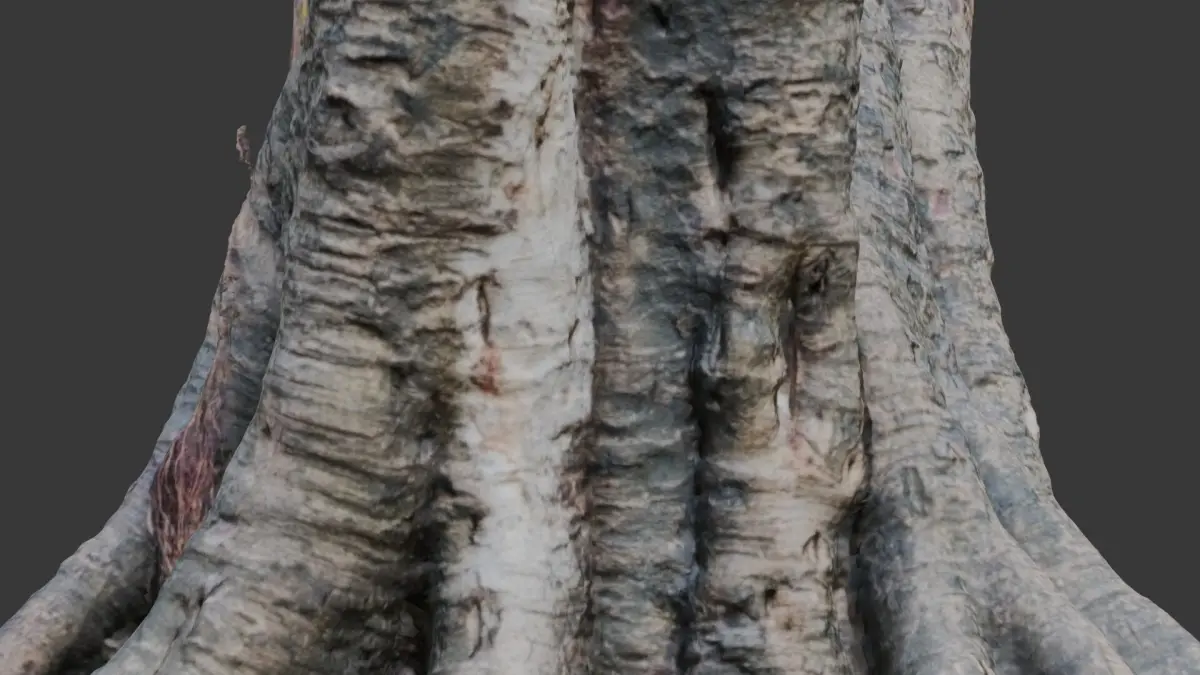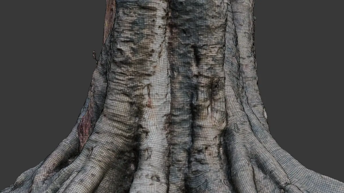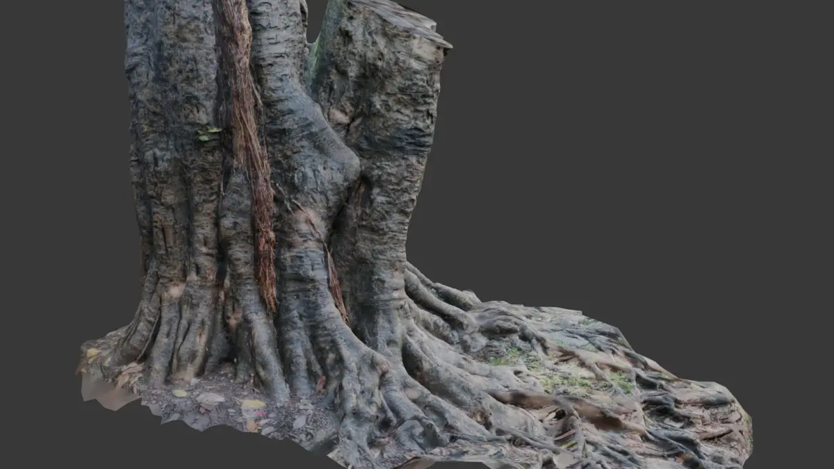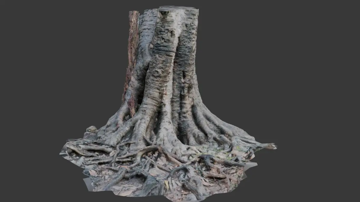 A high-resolution 3D scan of an ancient tree stump with exposed roots, featuring intricate bark details, twisted root formations, and natural imperfections. This highly detailed model is ideal for realistic forest environments, nature scenes, games, films, and architectural visualization.
