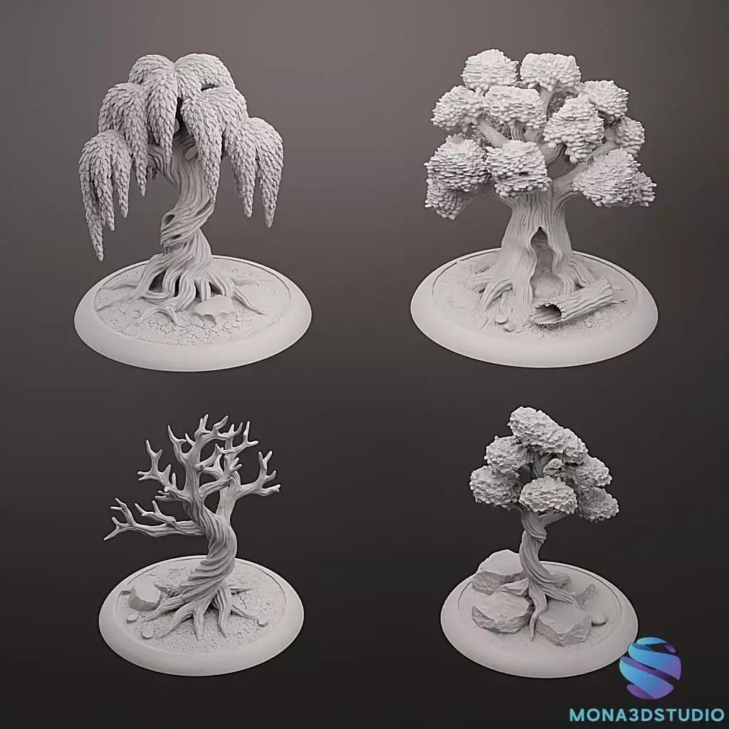 4 Fantasy Trees: Featuring a weeping willow, a hollow ancient oak, a giant bonsai-style tree, and a spooky dead tree.