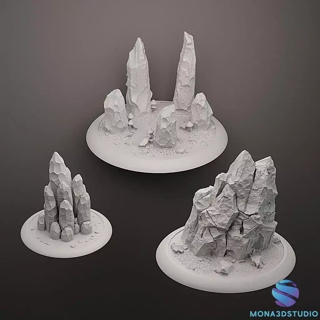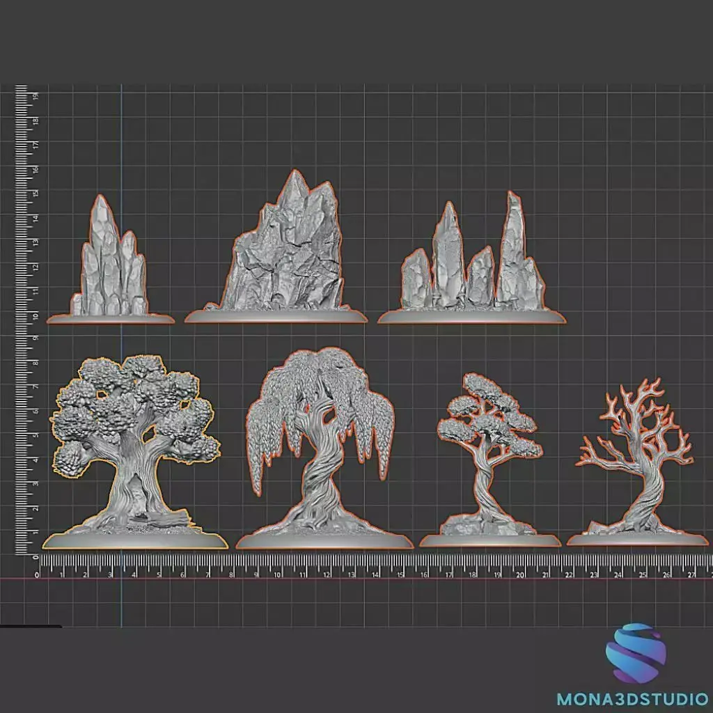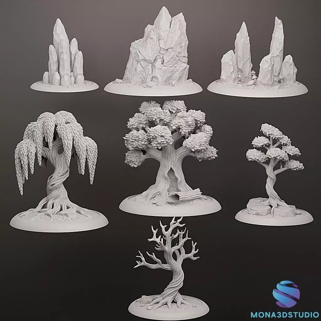 Elevate your tabletop battlefields with this comprehensive set of high-resolution natural terrain. Designed specifically for resin 3D printing, these models capture realistic organic details, from twisted bark textures to sharp, weathered rock faces.