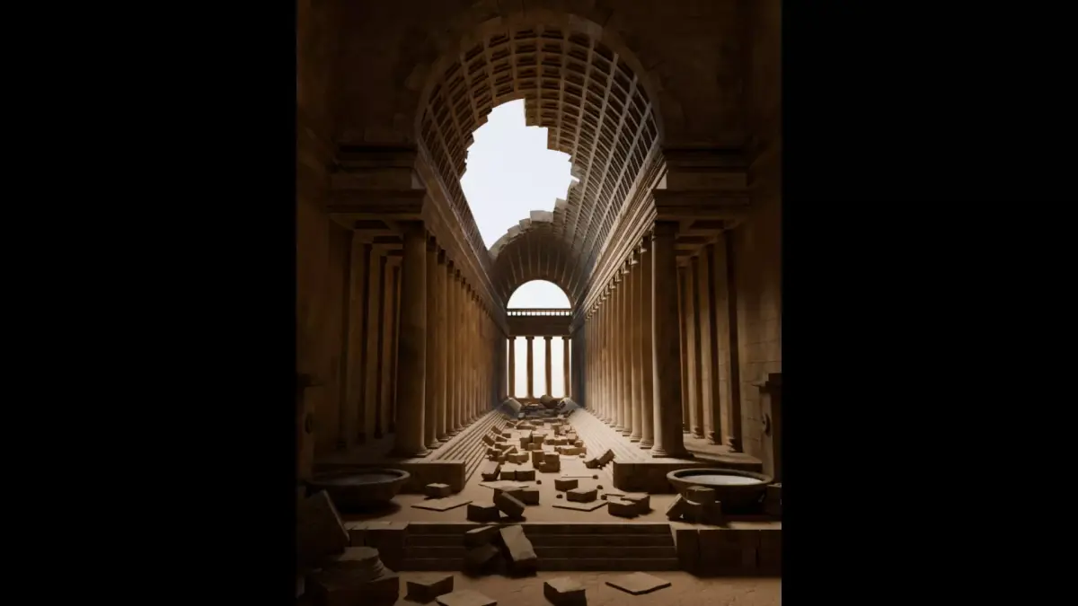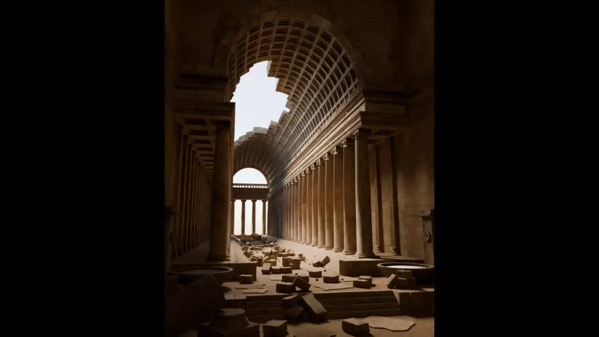 A highly detailed 3D environment inspired by the architectural ruins depicted in the works of Hubert Robert. The scene recreates the monumental scale of classical stone architecture through towering columns, a fractured vaulted ceiling, and a dramatic natural light shaft illuminating the central nave.