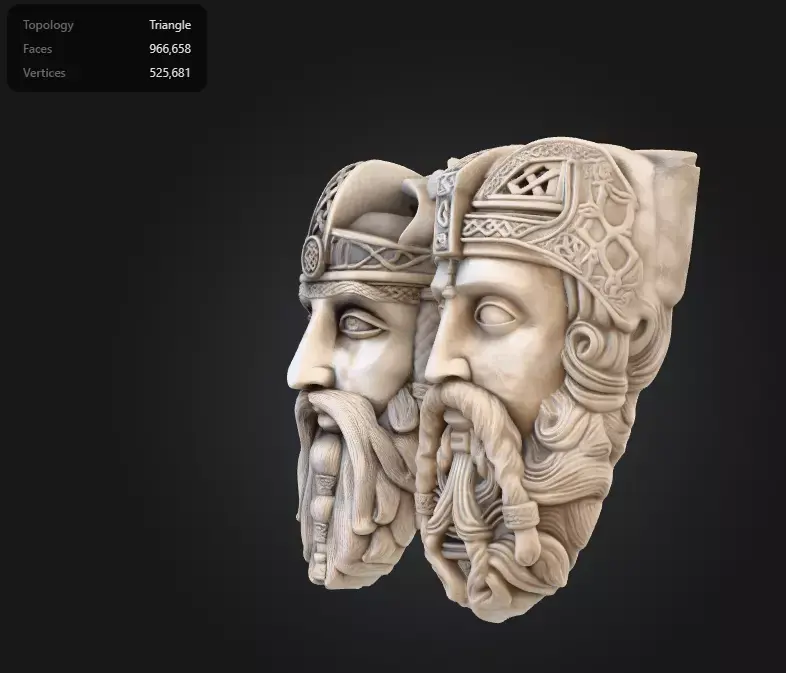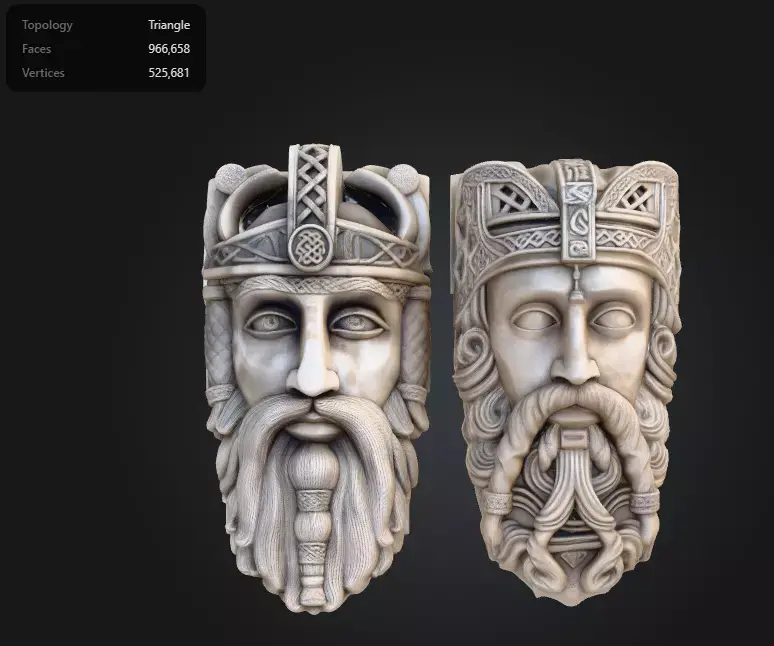 This is a highly detailed ancient-style bas relief featuring two medieval king faces carved in stone.The sculpture is inspired by Viking, Celtic, and early Christian medieval art with intricate braided beards, crowns, and ornamental patterns.