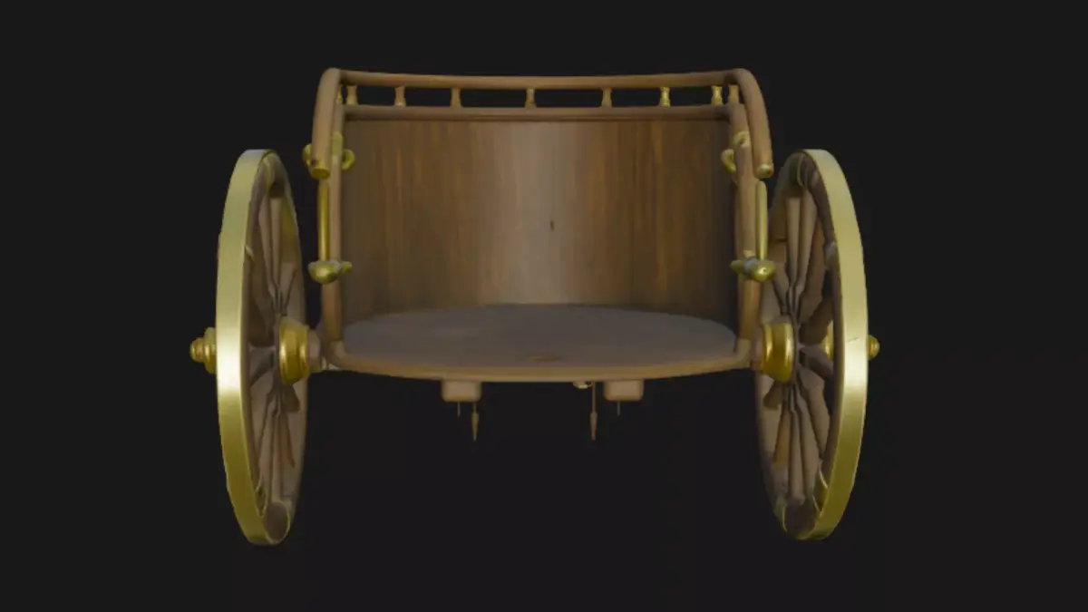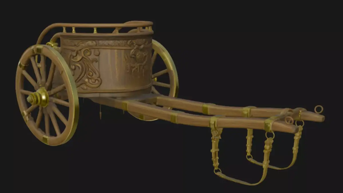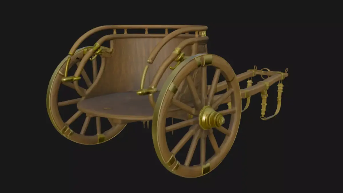 This exquisitely detailed 3D model captures an ancient wooden carriage from a bygone era, featuring luxurious tufted leather seating in rich brown tones, intricate gold filigree accents along the curved body, elegant lantern posts with glowing lamps, large spoked wheels with metallic rims, and a long extending drawbar for horse attachment. Rendered with high-poly precision on a transparent background for seamless integration into historical scenes, fantasy renders, games, or animations, this asset evokes royal elegance and timeless craftsmanship, complete with ornate engravings, brass hardware, and realistic wood grain textures.