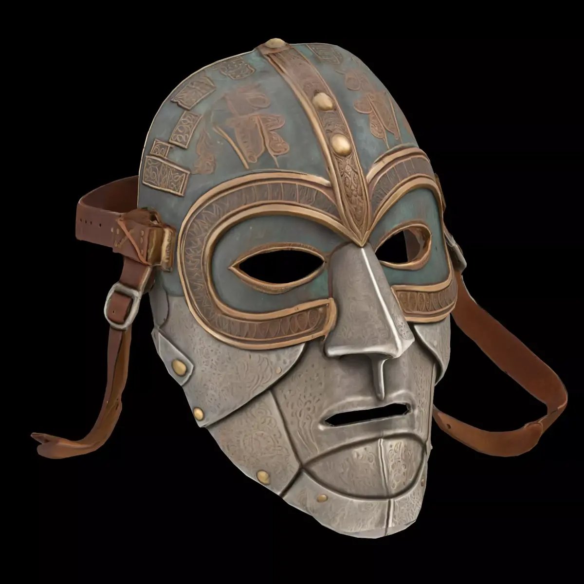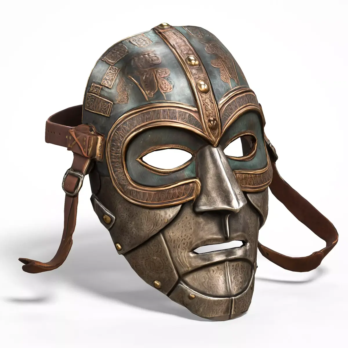 This hyper-detailed ancient warrior mask 3D model features carefully crafted bronze and weathered steel materials. The engraved tribal symbols and aged surface details give it a realistic and historical appearance. Complete with authentic leather straps and high-resolution PBR textures.