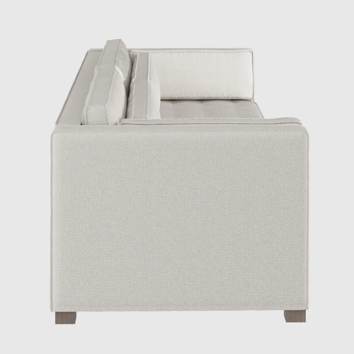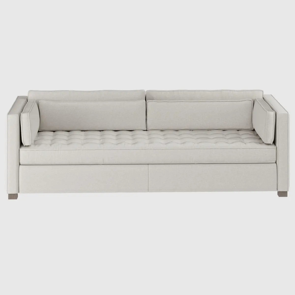 Andersen is a modern sofa bed with a one-piece seat and a single or double mattress. A narrow sofa bed with optional lumbar and armrests cushions.Andersen is a sofa bed with a one-piece seat that can be used as single or double bed.It is a 3-seater sofa with armrests as high as the backrest, and it is completed with a pair of lumbar cushions and two feather cushions that make the armrests more comfortable.By removing all these extra cushions, Andersen becomes a comfortable single bed with a cm 212 or 222 long and cm 60 deep mattress. Thanks to an easy to use mechanism, it is also possible to transform the sofa into a double bed with a cm 190 or 200 long mattress. Moreover, with the mattress folded on the short side, the depth of this design sleeper bed does not increases much even when it is used as double bed.Andersen can be customised as you like by choosing model and dimensions, cover and piping, finishes and colours, legs material and extra cushions.