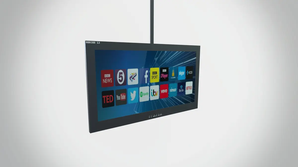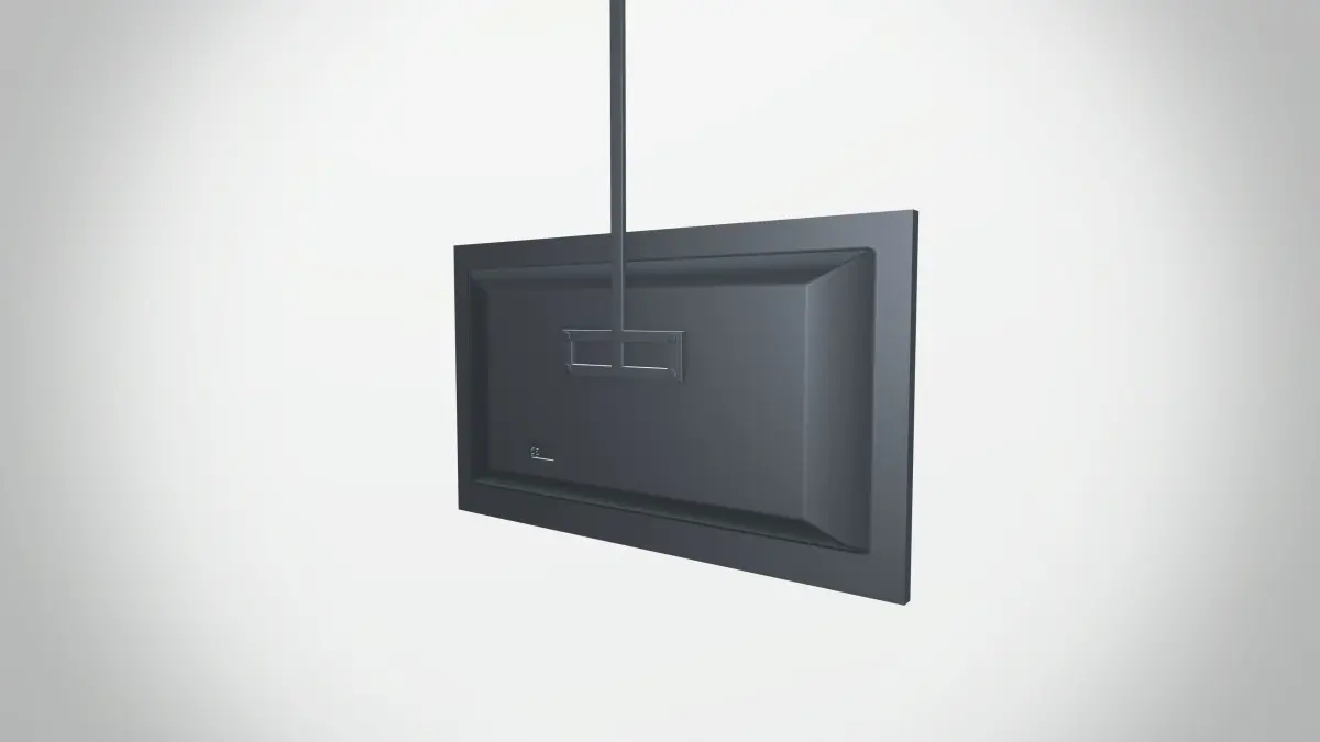 - Whether it's in a waiting room, lobby, or living room, this black television hanging from a hook is sure to grab attention and impress viewers.