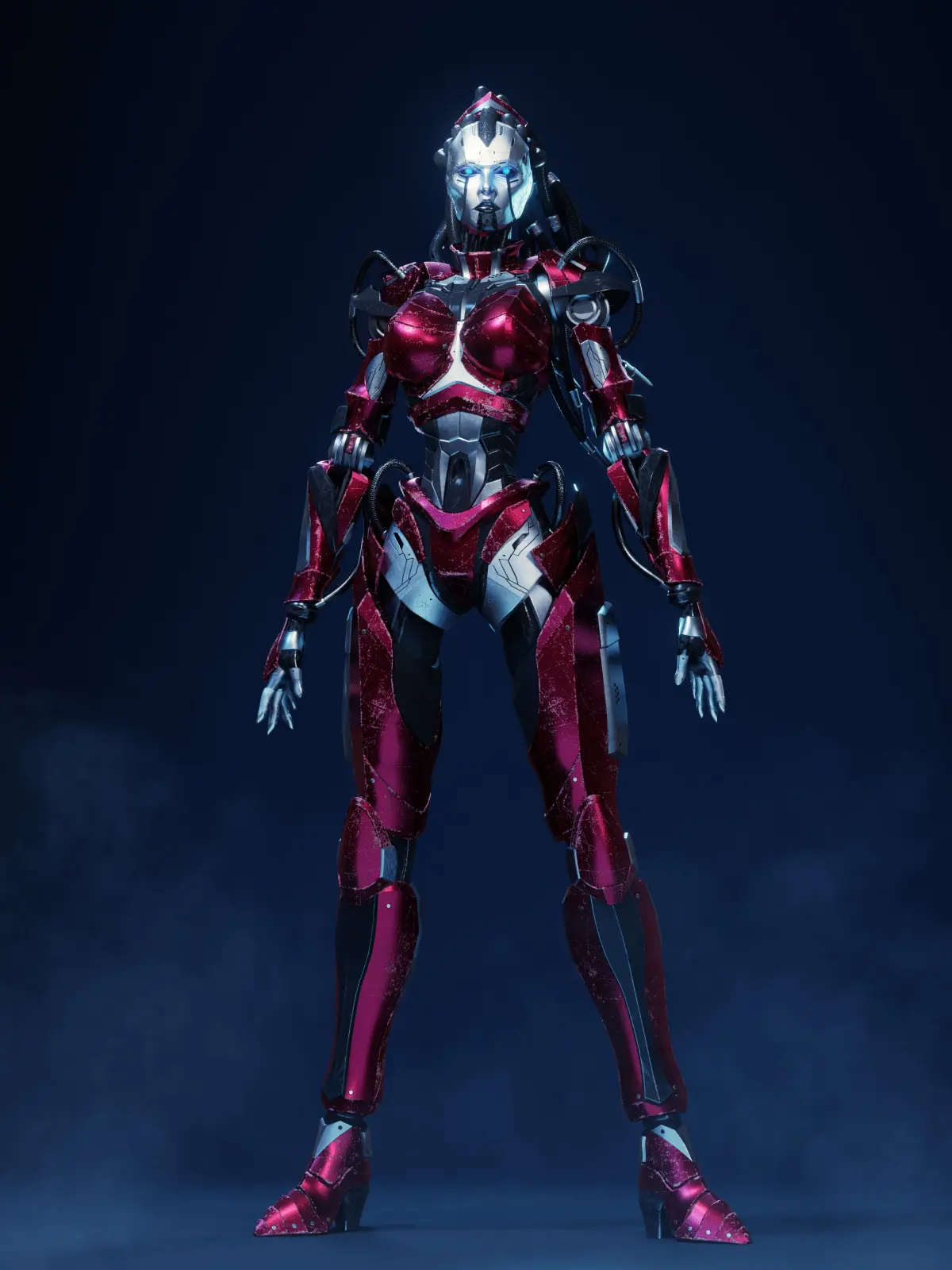 Custom designed female robot character, themed with android queen aesthetic. Suitable for games and subdivision-ready for films or close up. Comes with full rig in Blender file. PBR textures in 4K quality.