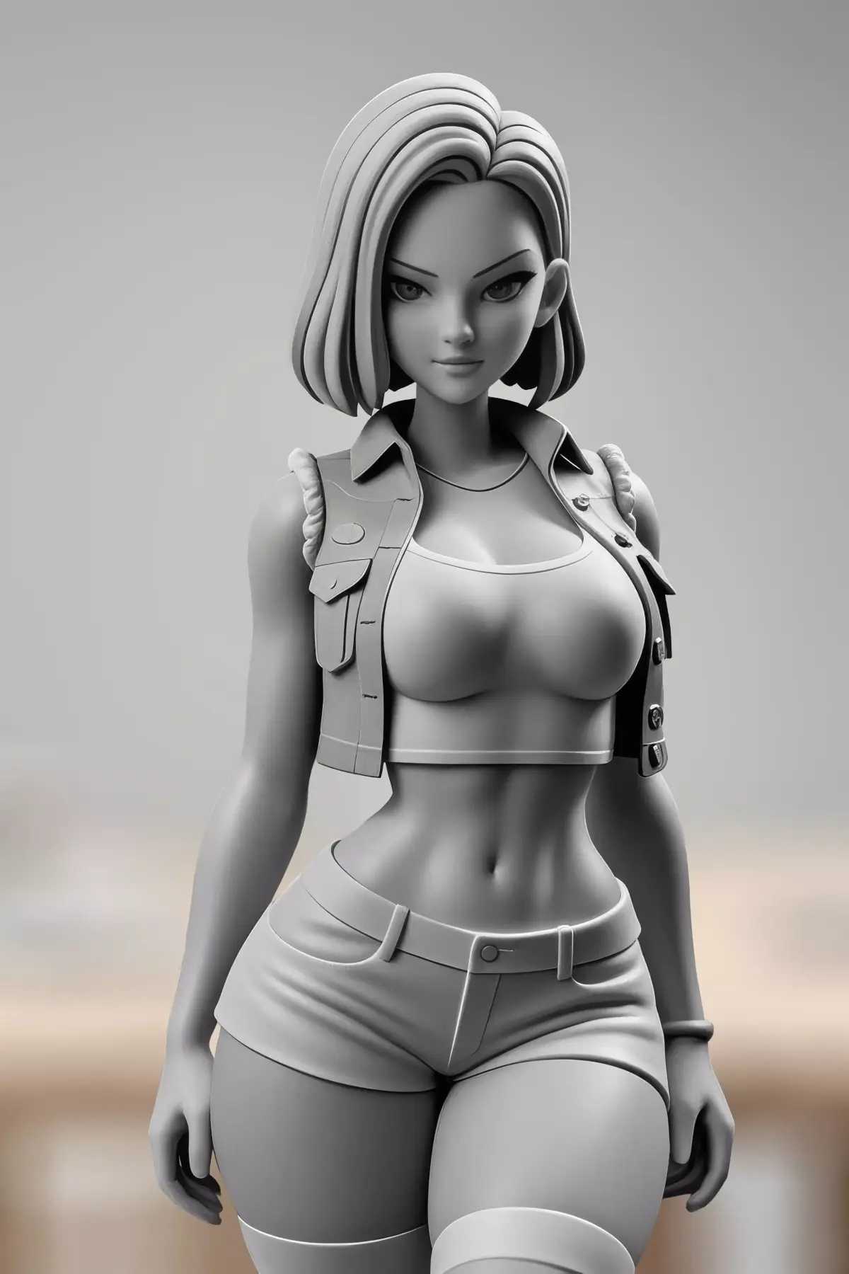 This image showcases a hyper-realistic and finely detailed 3D representation of Android 18 from the Dragon Ball Z universe. She is portrayed in a striking frontal pose, highlighting her confident and composed demeanor. The character wears her iconic short blue vest with gold buttons, a white crop top, and matching white shorts, perfectly capturing her recognizable anime design. Her blonde bob haircut and piercing blue eyes are meticulously recreated, giving the figure a lifelike yet stylized appearance. The background features a breathtaking coastal sunset scene, with rocky cliffs and calm ocean waters bathed in warm golden light, adding depth and atmosphere to the composition. Every detail, from the textures of her clothing to the subtle shading of her skin, is rendered with precision, making this artwork ideal for high-resolution resin printing or CNC router engraving. This piece combines artistic beauty, anime authenticity, and technical accuracy, ensuring an exceptional result in any 3D production.