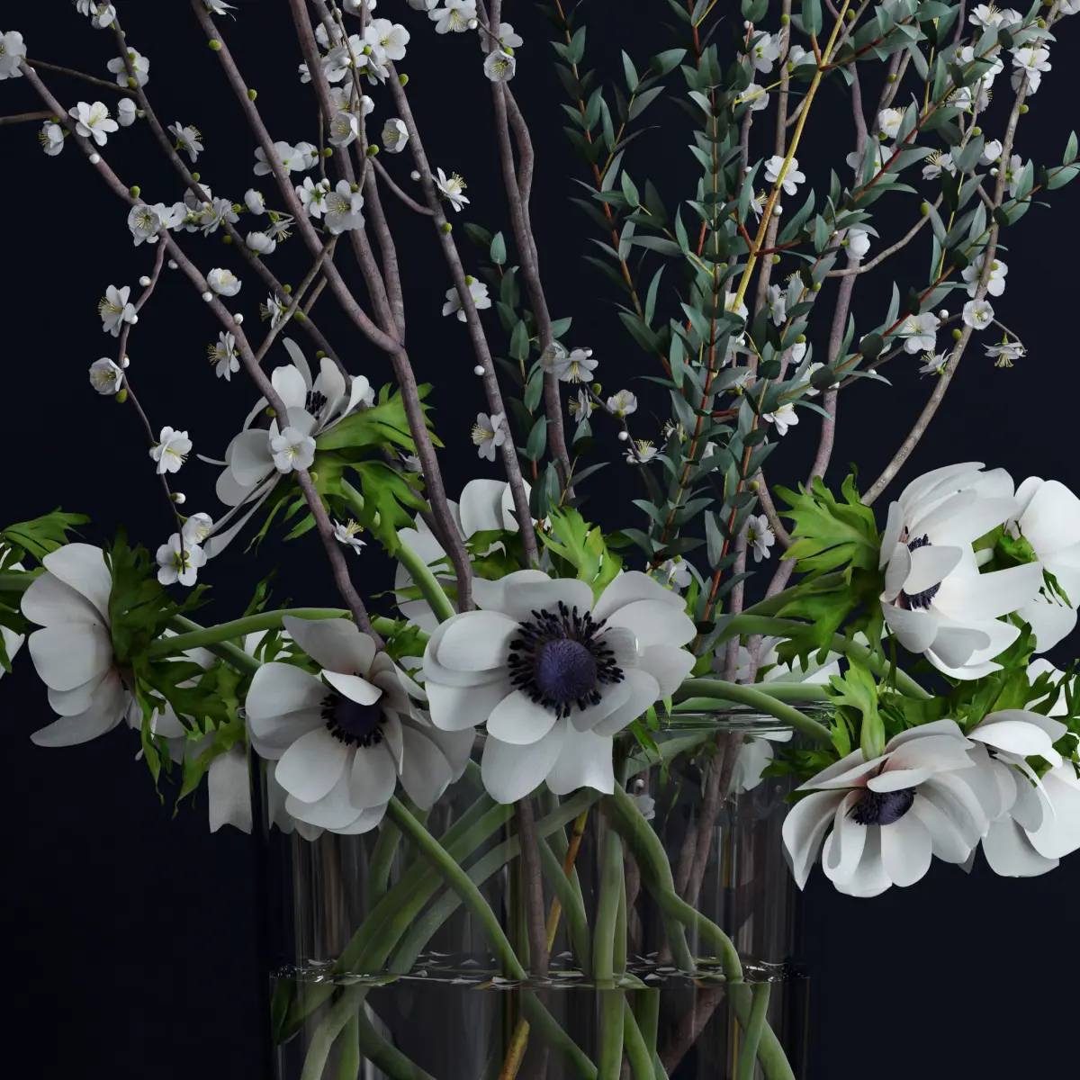 File includes white anemones coronaria, eucalyptus parvifolia and white prunus branches in glass vase. Native format is 3dsmax 2014. Anemones and vase are covered by Turbosmooth modificator with 1 itteration.