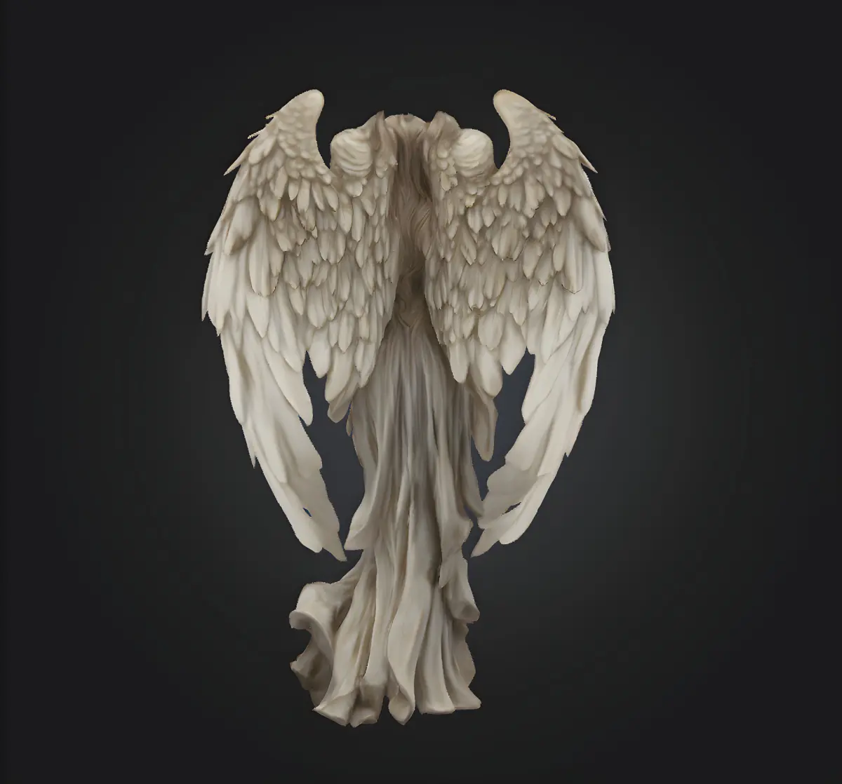 The angel's wings are a masterpiece of detail, with each feather meticulously modeled to create a sense of depth and texture. The wings are spread wide, with the tips slightly curved upwards, giving the impression of gentle movement. The feathers are rendered in a soft, creamy white, with subtle shading that creates a sense of volume and dimensionality.