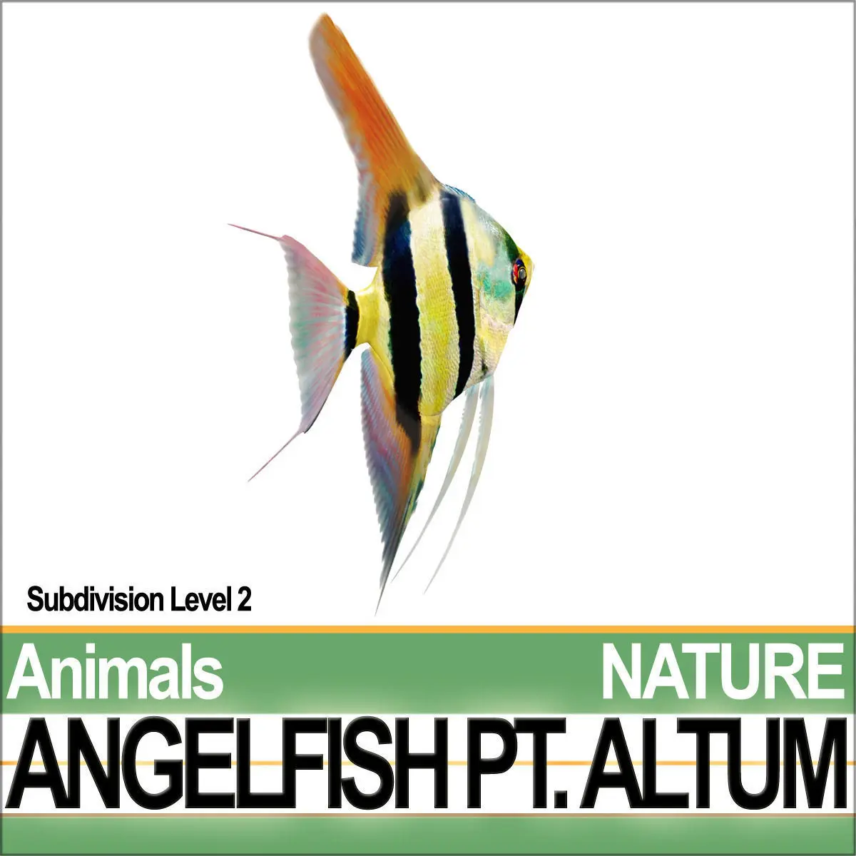 In the package you will find:1- 1 Angelfish Pterophyllum Altum detailed SL0 [with uvmapped Body Parts and Mouth];2- Texture Set;3- 5 Hi-Quality Hi-Def PhotoReal Textures [4096x4096];4- Alternate textures to customize the models;5- Real World Scale SmartCgArt Man Reference System with models [C4D, VUE, 3DS, OBJ, DXF].