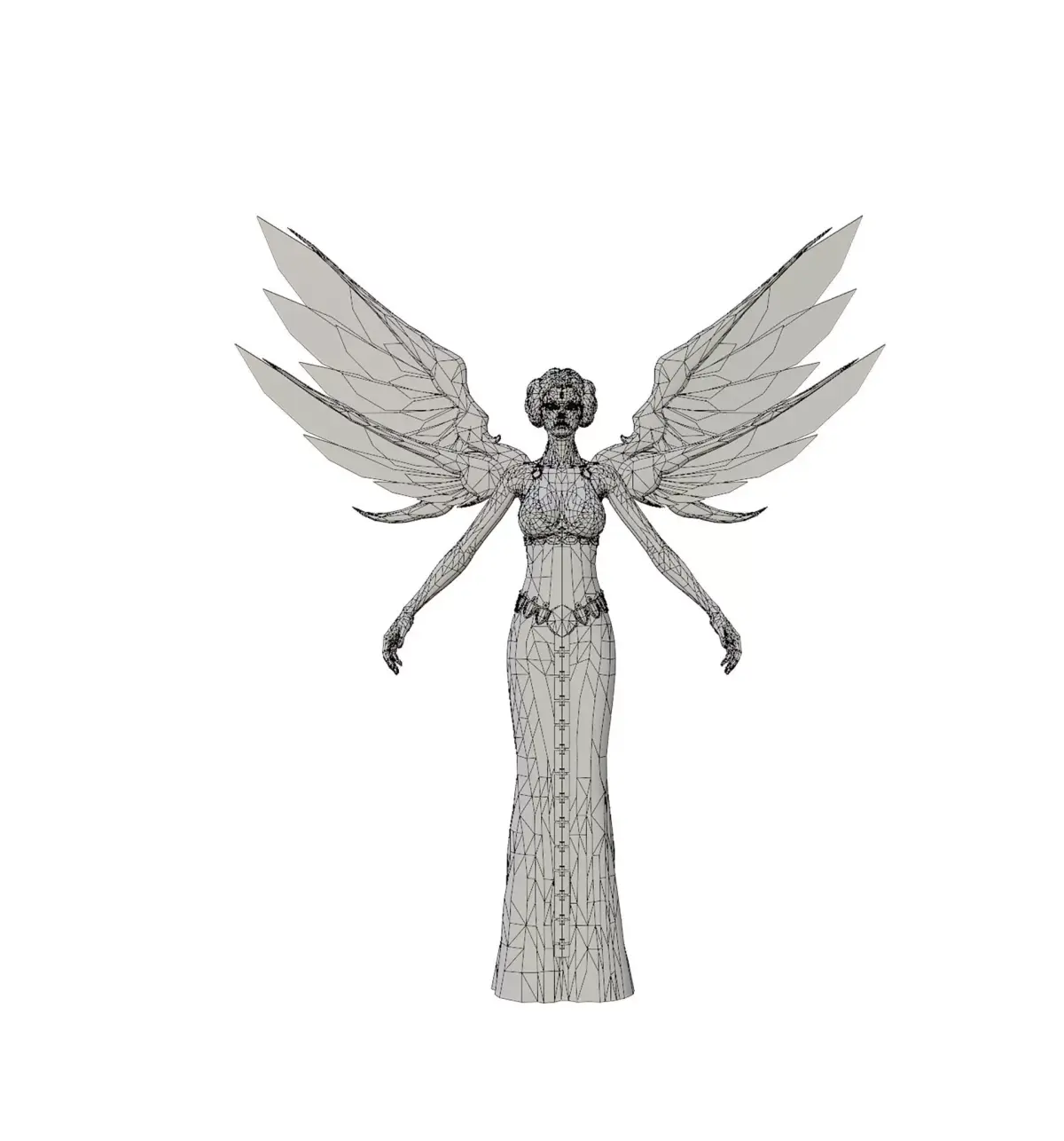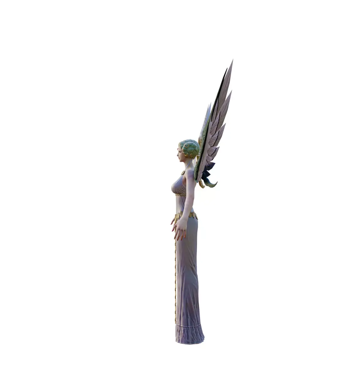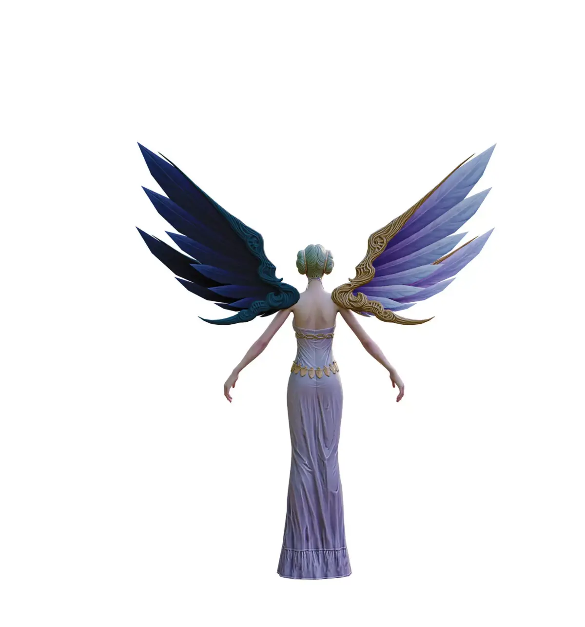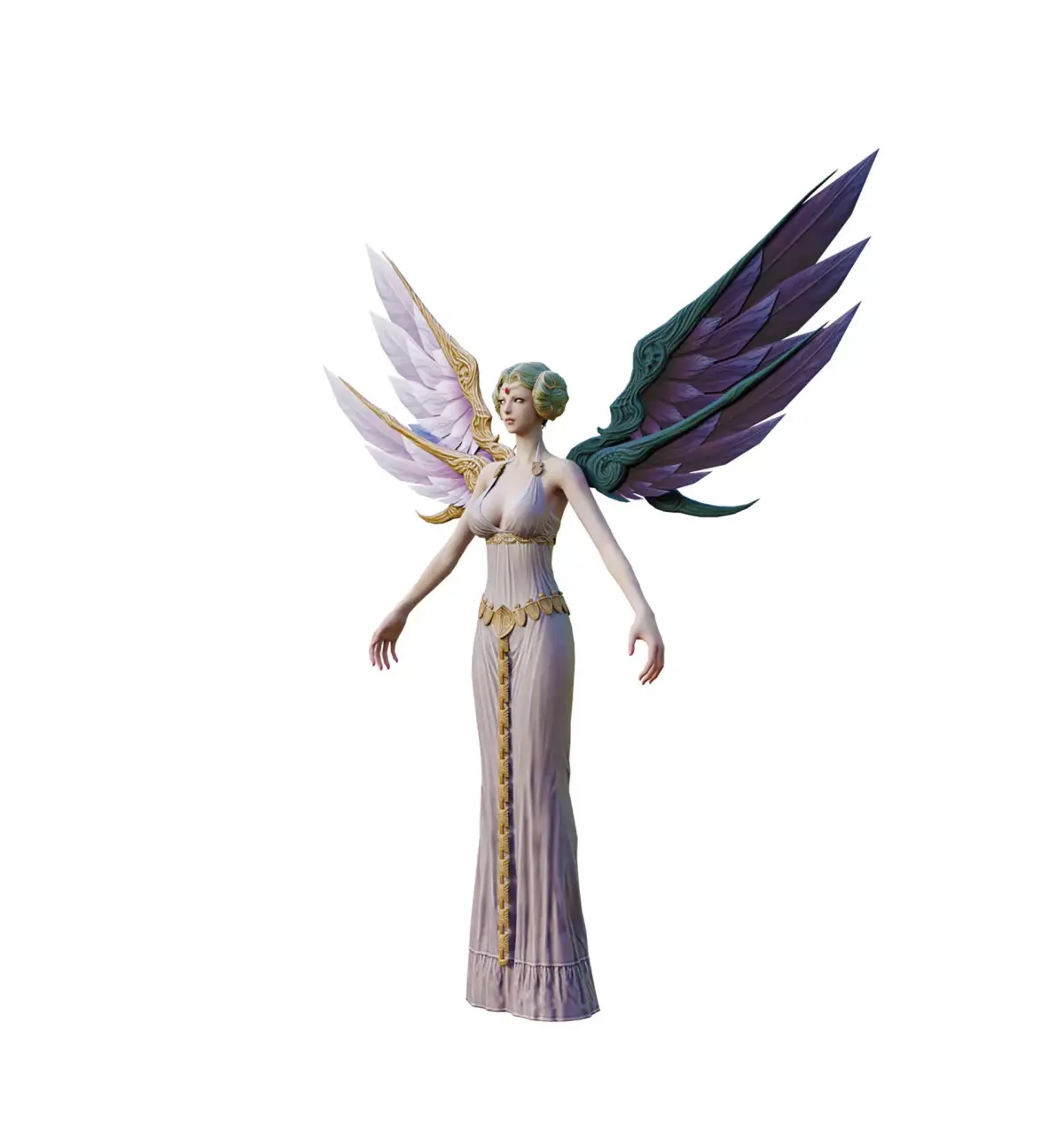 A 3D-rendered fantasy female character with asymmetrical wings: one wing is translucent pale purple with golden decorative details, and the other is dark purple-green with layered feathers. She wears a floor-length, light gray gown embellished with intricate golden patterns, giving her an ethereal, angelic or elven appearance.