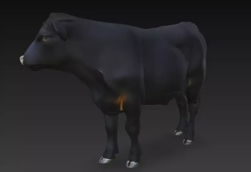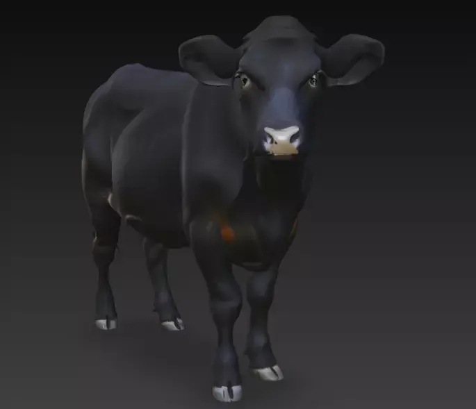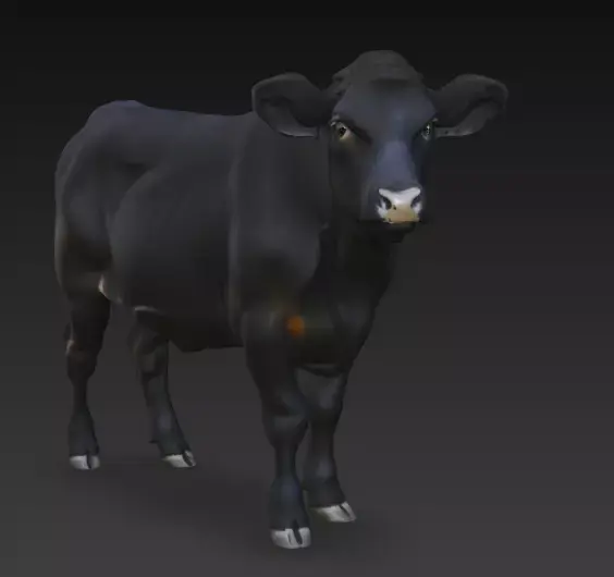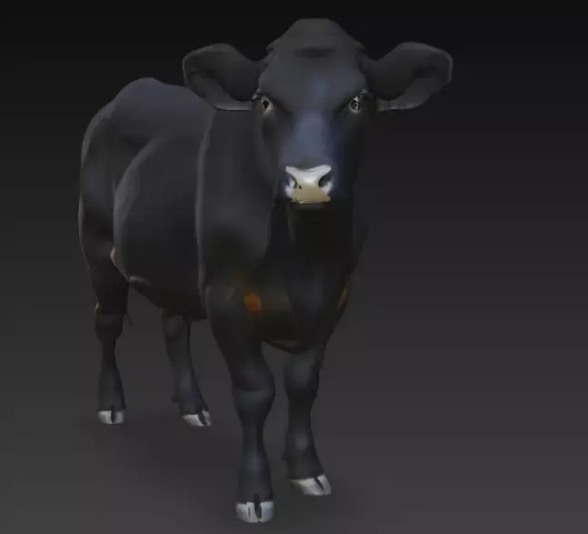 This meticulously crafted 3D model showcases an Angus cow standing with a solid black coat, highlighting its muscular build and subtle white markings on the muzzle. The model features a smooth texture and realistic proportions, making it ideal for virtual farm environments, educational tools, or livestock simulations. The detailed design captures the cow's sturdy legs and robust frame, perfect for digital rendering or animation projects.