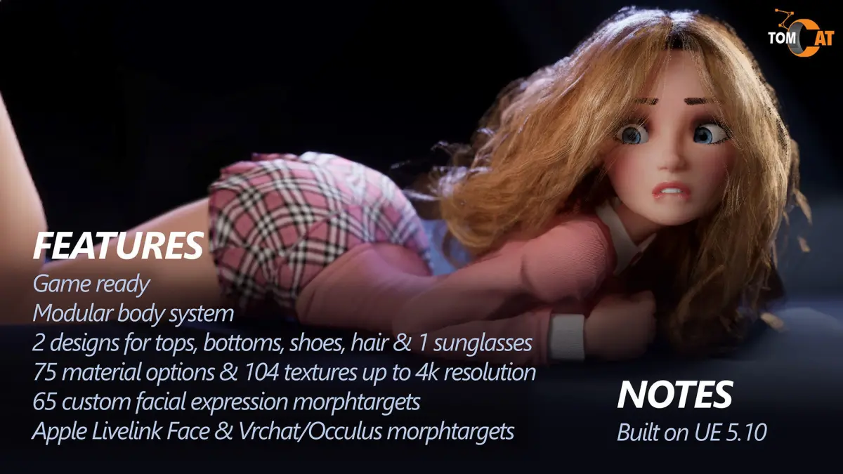 Comes with 75 premade materials with many adjustments, so you can change how your character looks. Different clothing, hair or eye colors and different skin tones.