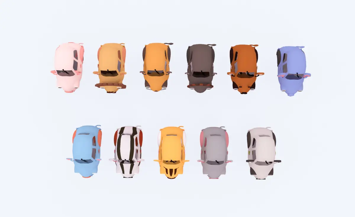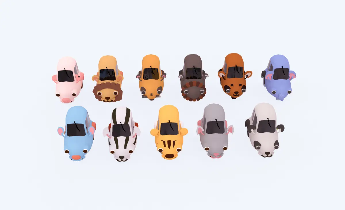 - Animal Car Toys Pack 01 includes 11 children's toy cars with cute animals such as: Tiger, lion, cat, pig, cow, elephant, goat, giraffe, rat, gecko, rabbit