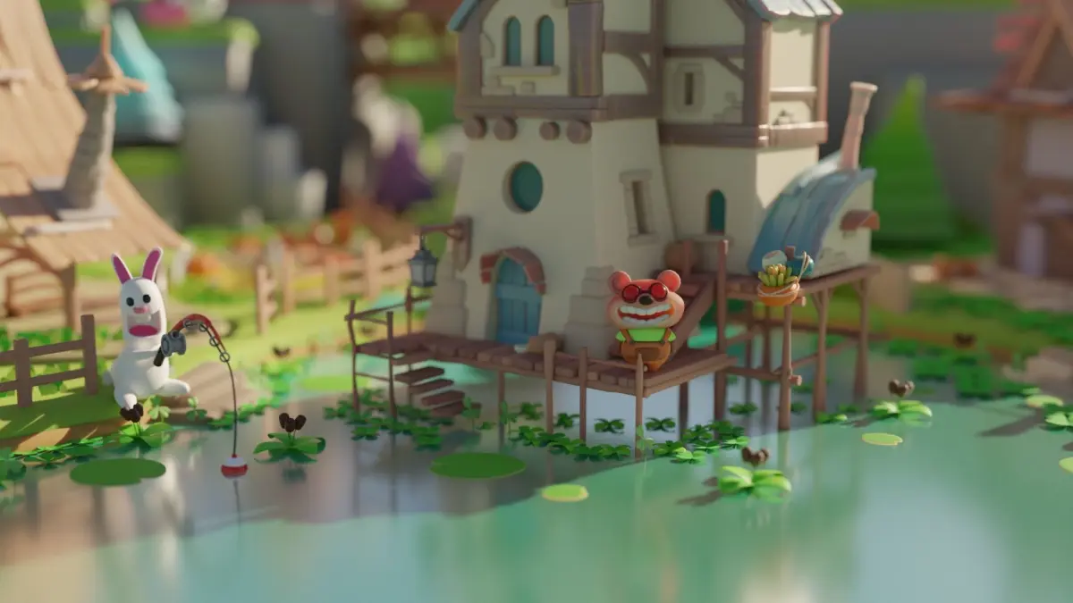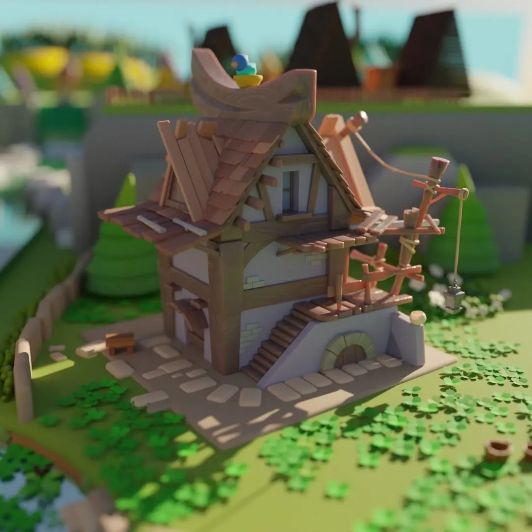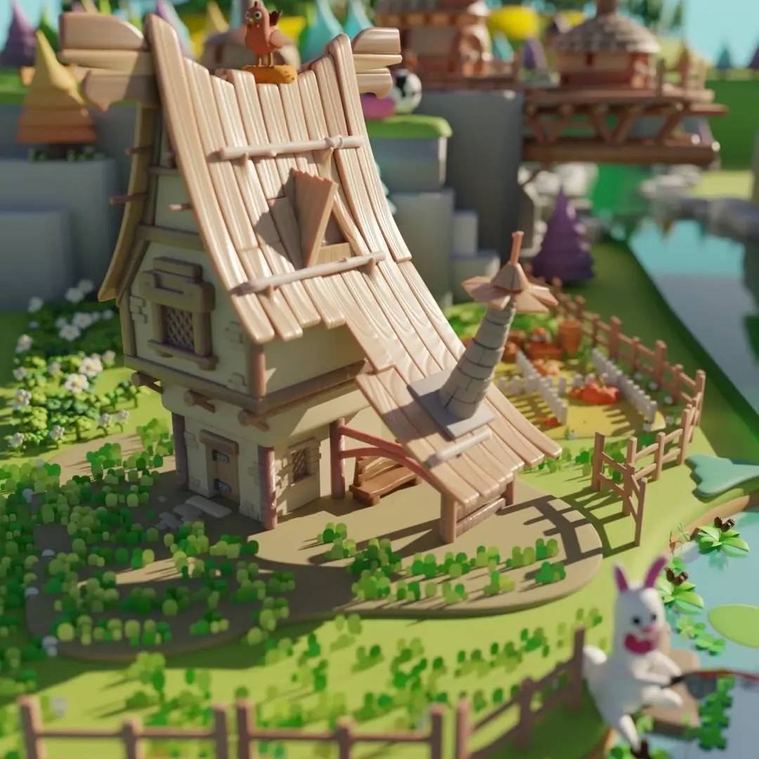 assets of wood , flowers, shels, houses, trees, animals , rocks