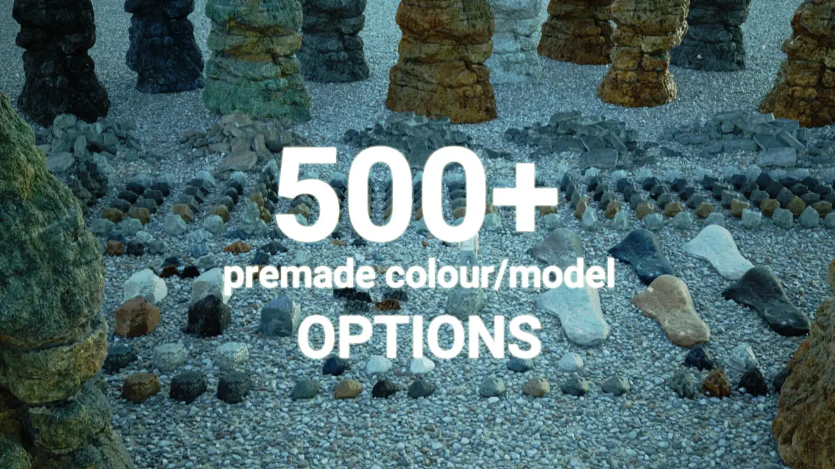 A vast selection of various scanned rocks and extra 50 sharp CG rocks all with 6 colour versions will help you solve most of your rocky visuals.