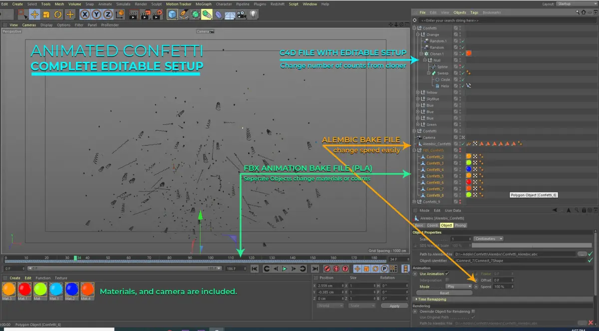 Animated Confetti with ultra realistic animation made in C4d. You can use in your projects just import in your scenes Change your desired Colors and hit render. its a complete 175 Frames realistic and editable Animation, you can easily modify or change Number of counts, Speed and Duration. no plugins needed, its a complete editable setup.