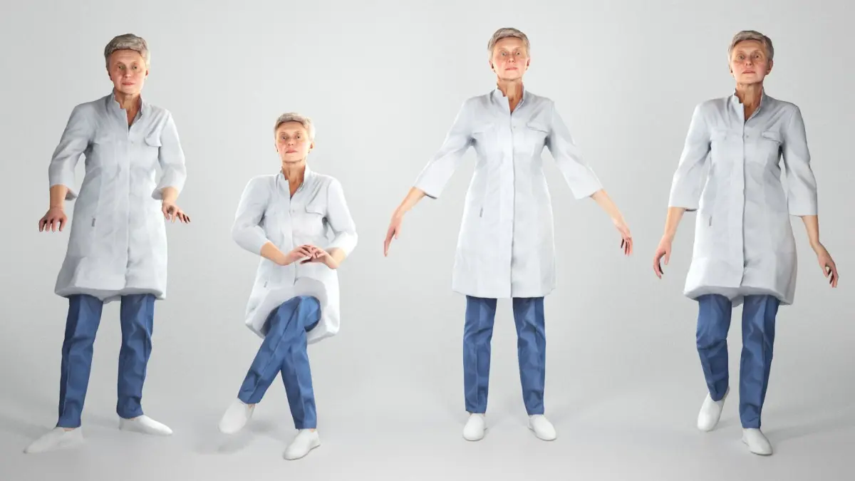 This is a true human size and detailed model of a adult beautiful woman of Caucasian appearance dressed in a uniform of a medical doctor. The model is rigged via Mixamo and saved in .fbx format animation. Additionally you can find this model captured in A-pose, ready for further custom rigging and animation according to your needs and preferences.