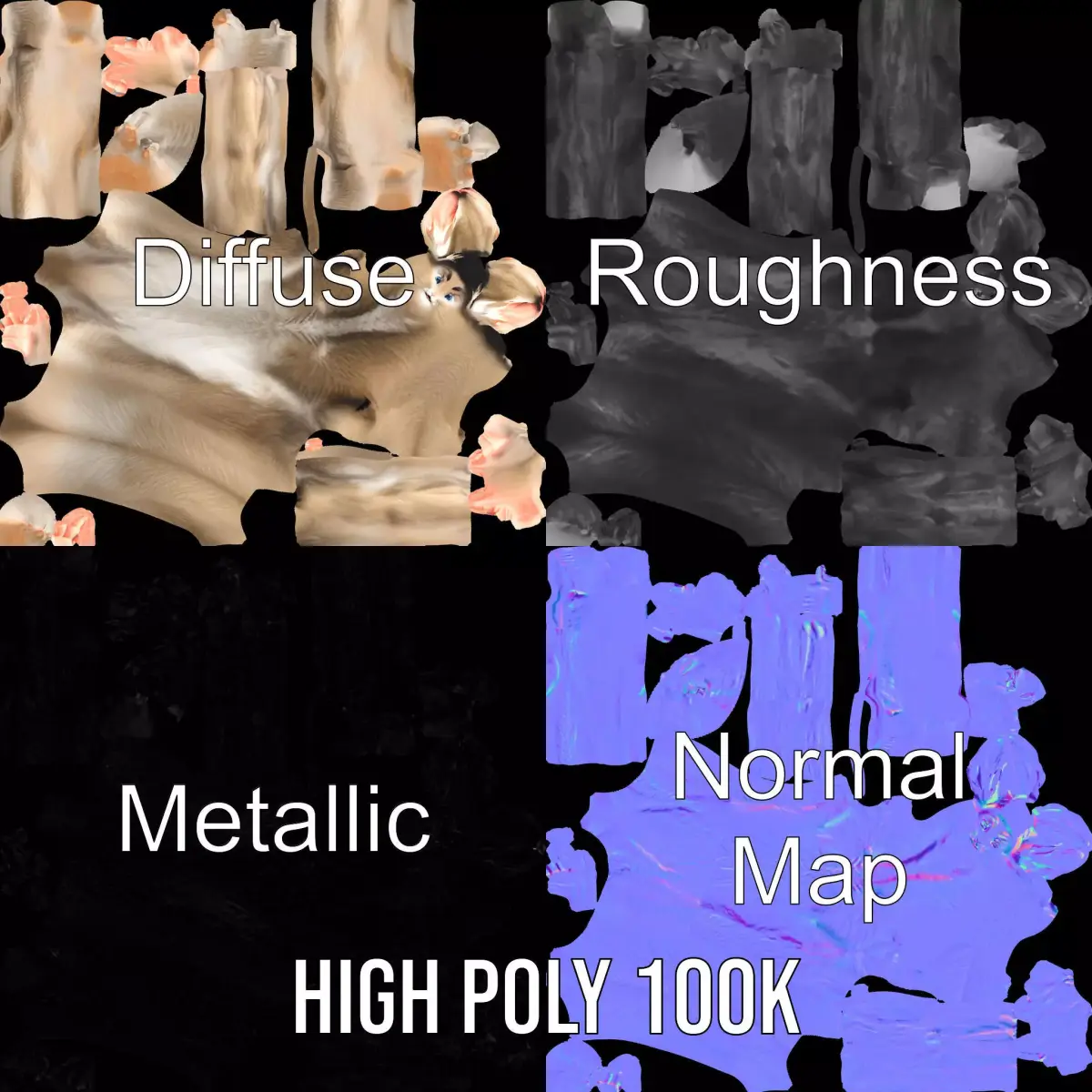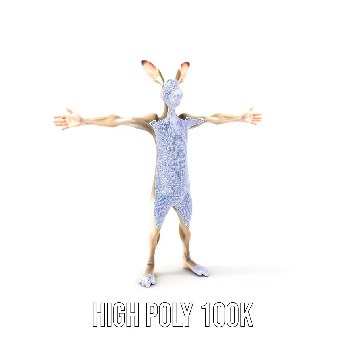 This is a highly detailed 3D model of an animated rabbit character, perfect for use in cartoons, animation films, or video games. Its expressive features and realistic fur make it ideal for adding life and personality to any 3D scene. Each model has 3 levels of detail: low-poly(1000 triangles for mobile), middle-poly(10 000 triangles for environment), and high-poly(100 000 triangles), which allows for the use of this model in production rendering (such as 3ds Max, Maya, Cinema4D, Blender, Vray/Corona/Cycles and all other), game engines (Unity and Unreal compatible), and interactive presentations, providing a choice of detail based on the LOD System principle. Perfect for animation projects, kids' games, or educational purposes. The model's textures are PBR, Diffuse, NormalMap, and reflection/roughness/metallic, which are suitable for any modern rendering engine. All models accurately unwrapped and have no overlapping UVs. All textures are 4096*4096 in size. If you enjoyed the model, please like and leave a comment!