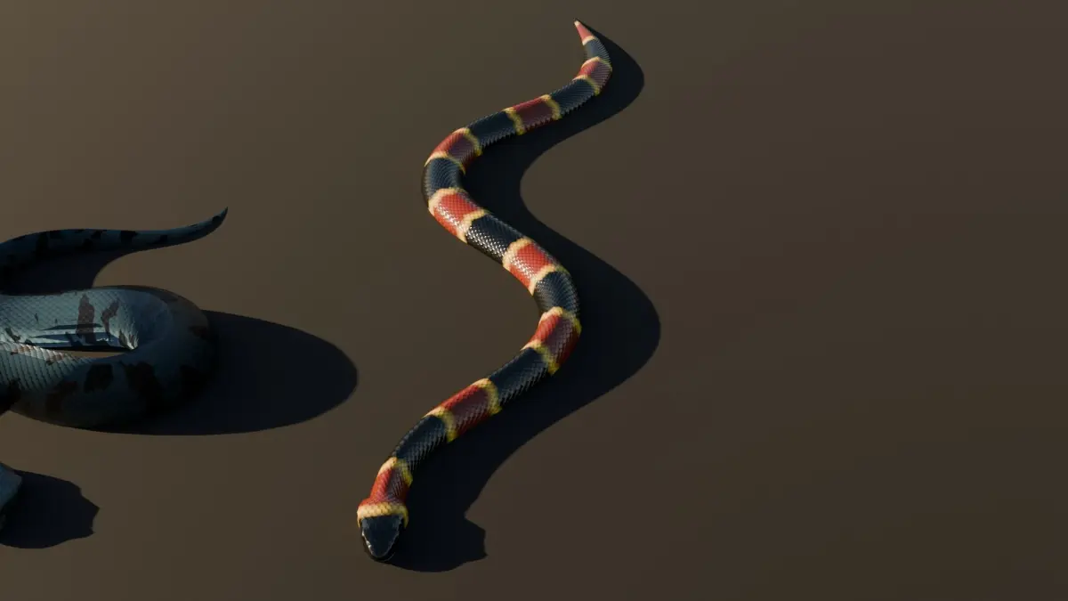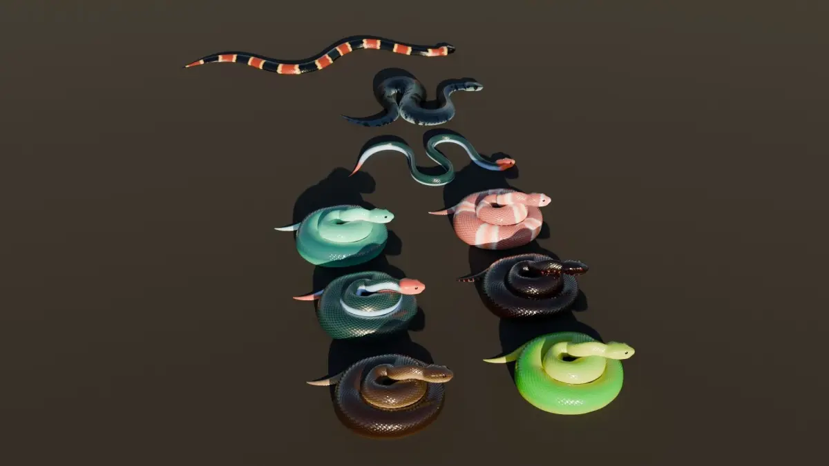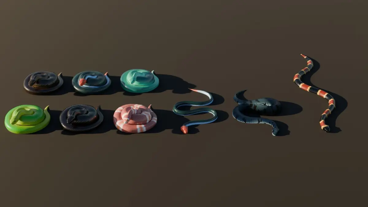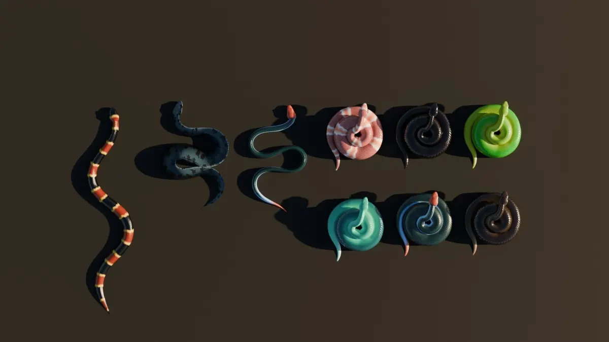 I have long sought a way to animate a realistic movement of a snake, here is the result of my experimentations. I also had fun making textures, some are inspired by real snakes!