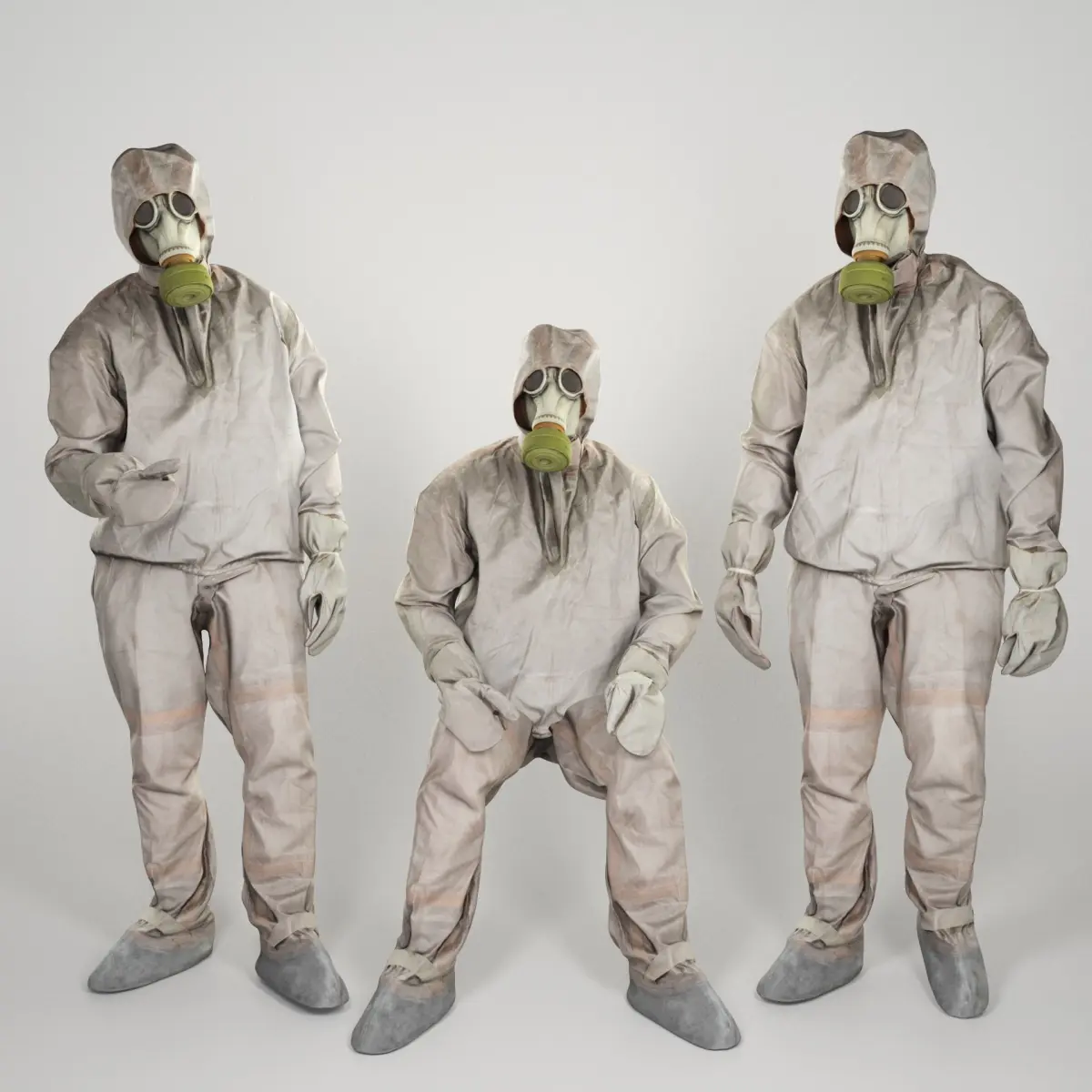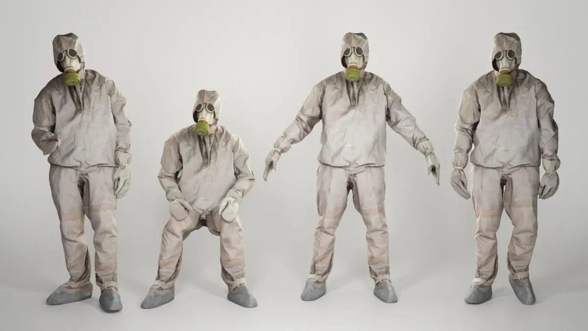 This is a true human size and detailed model of a Stalker inspired character - a liquidator of nuclear catastrophe in Chernobyl dressed in authentic real chemical protection commonly used in USSR in 80-90s. All props and suit are original. The model is customly rigged via Cinema4D R21 and animated. Additionally you can find this model captured in A-pose, ready for further custom rigging and animation according to your needs and preferences.