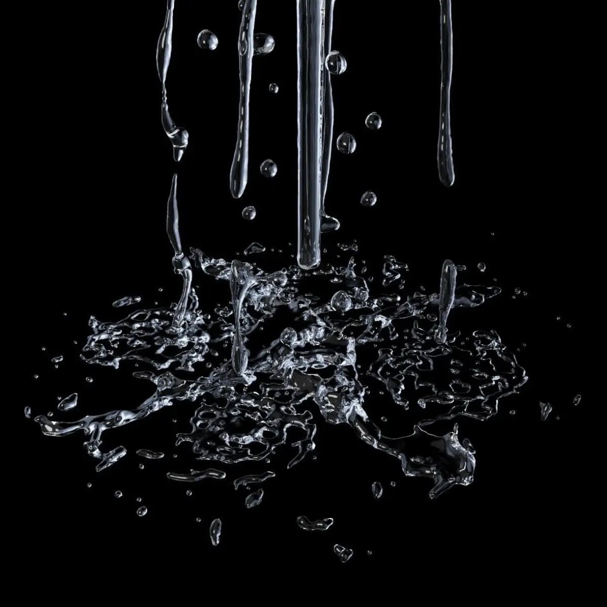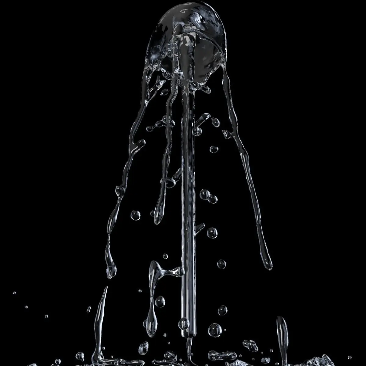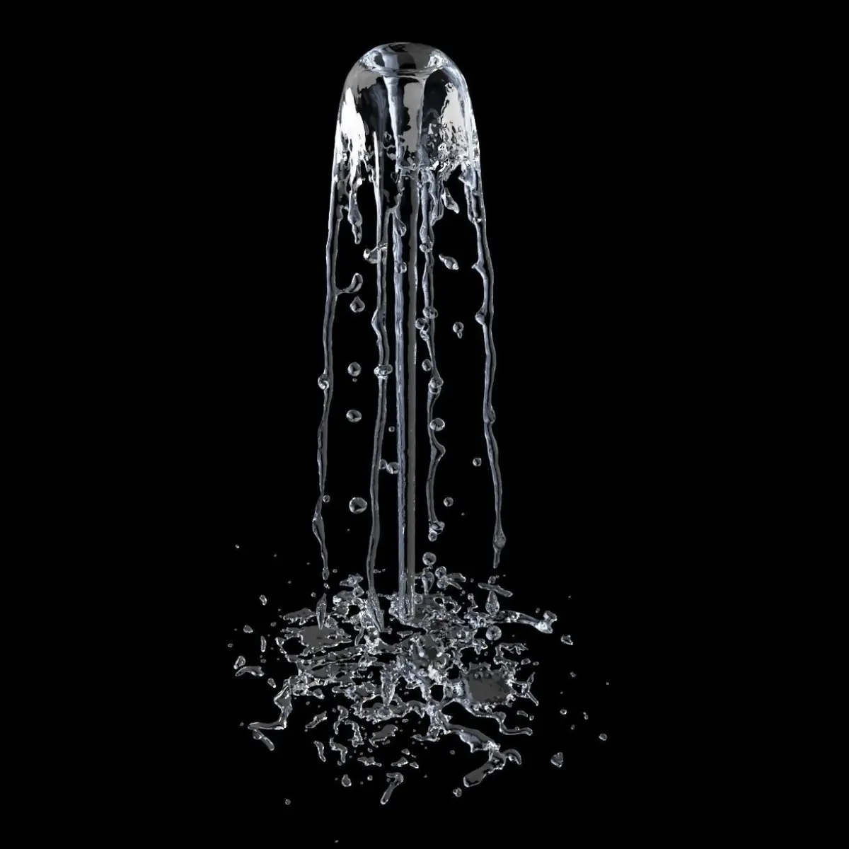Animated with a liquid simulator, 10 seconds of realistically flowing fountain water, shooting upwards then falling to the ground with splashes.