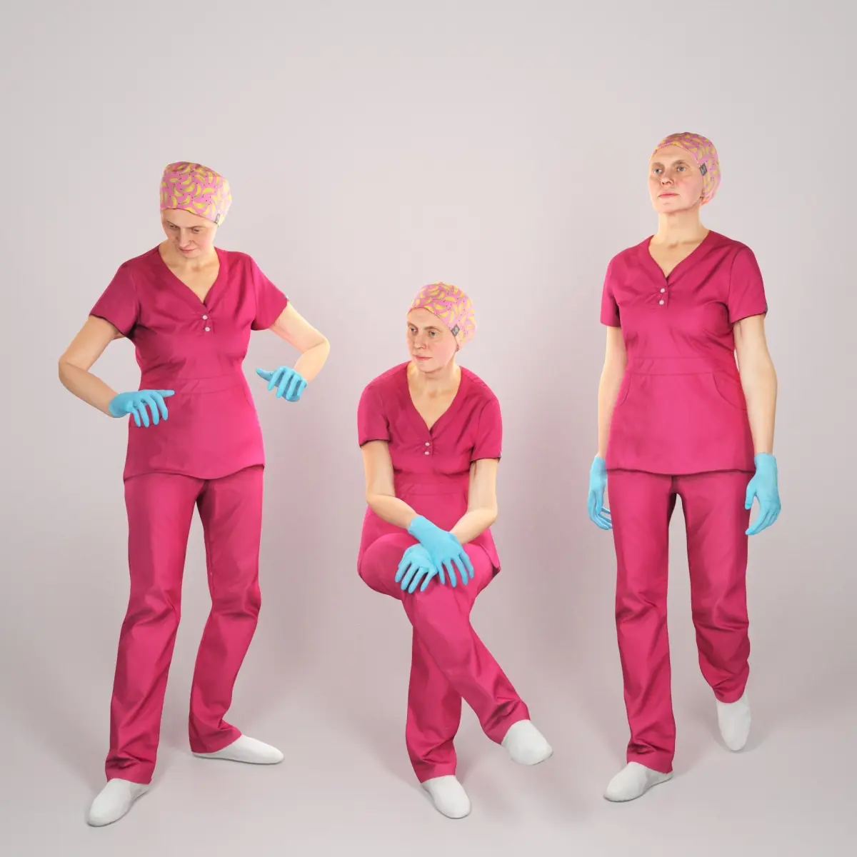 This is a true human size and detailed model of a adult beautiful woman of Caucasian appearance dressed in a uniform of a surgeon. The model is rigged via Mixamo and saved in .fbx format animation. Additionally you can find this model captured in A-pose, ready for further custom rigging and animation according to your needs and preferences.