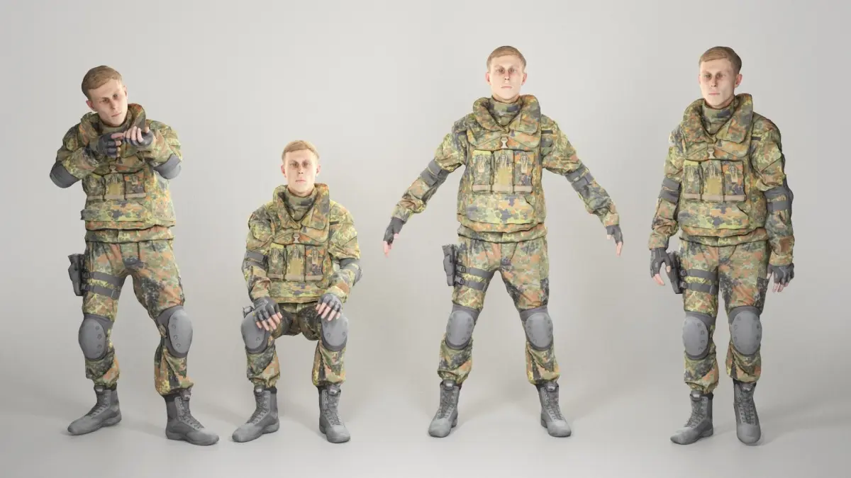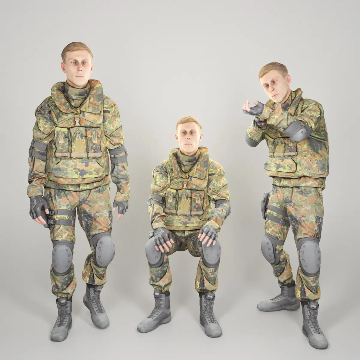 This is a true human size detailed model of a brave soldier of Caucasian appearance dressed in a Bundeswehr uniform with knee and elbow pads. The model is rigged via Mixamo and saved in .fbx format animation. Additionally you can find this model captured in A-pose, ready for further custom rigging and animation according to your needs and preferences.