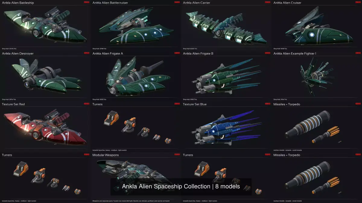 This collection contains 8 scifi spaceship models. The models have modular weapons. All models have 5 different texture sets. All ships are available for single purchase too.