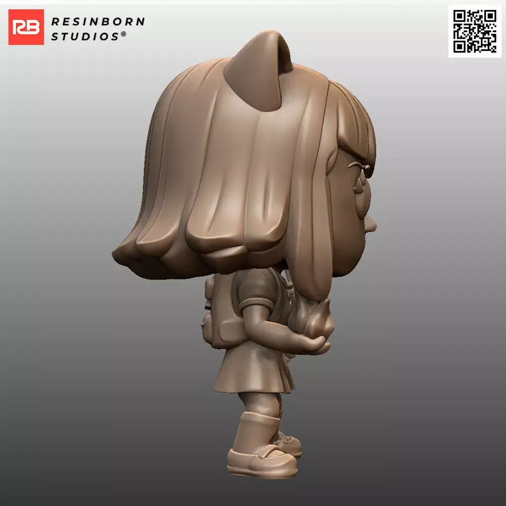 Iconic Design: Features her signature pink hair with cat ears, her blue dress, and her backpack with the small bear (Tibbers) peeking out.