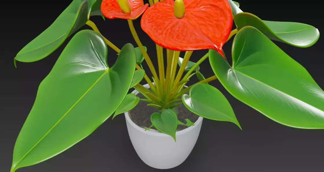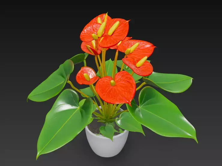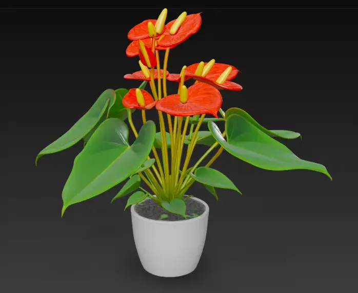 A stunning 3D-rendered anthurium plant with vibrant red spathes and yellow spadices, complemented by glossy green heart-shaped leaves, nestled in a sleek white pot.