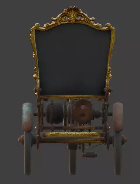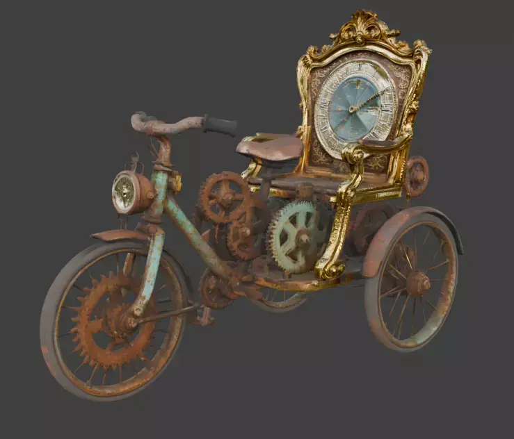 The Antiquated Clockwork Trike is a masterpiece of steampunk 3D design, merging Victorian elegance with complex mechanical ingenuity. This unique vehicle features a central high-back throne seat crafted from an ornate, gold-framed astronomical clock, complete with Roman numerals and a celestial map dial. The chassis is a marvel of exposed clockwork, featuring a vast network of interlocking copper and brass gears, drive chains, and rotating cogs that power the three-wheeled system. Extensive realistic weathering defines the model, showcasing layers of turquoise verdigris, deep rust, and oxidized metal across the frame and fenders. With a vintage leather spring-seat and a secondary clock-face headlight, this trike is a perfect high-quality asset for fantasy RPGs, industrial-era cinematic renders, or as a characterful centerpiece in digital collections.