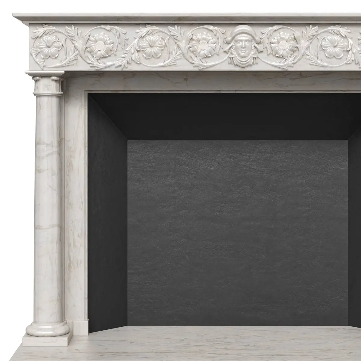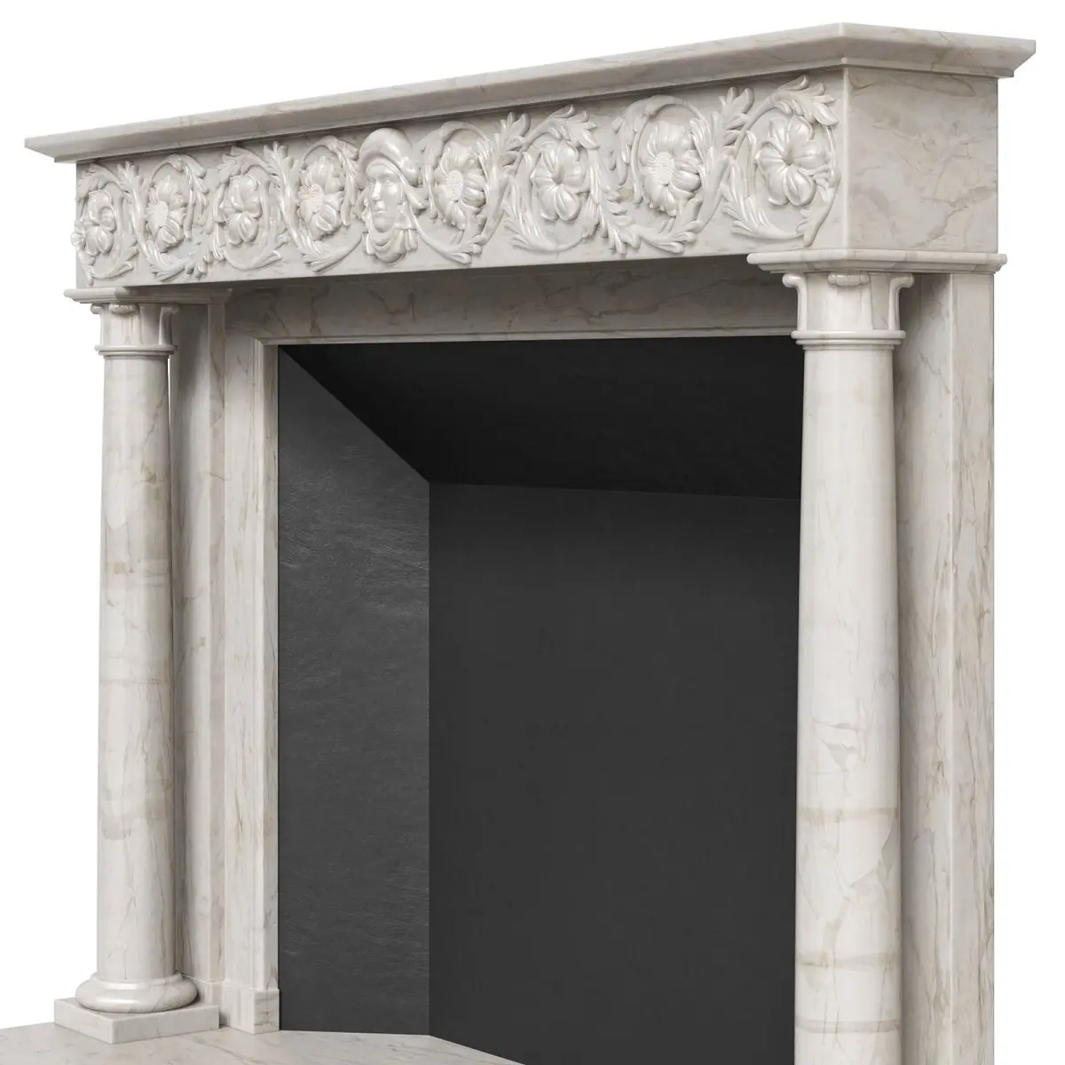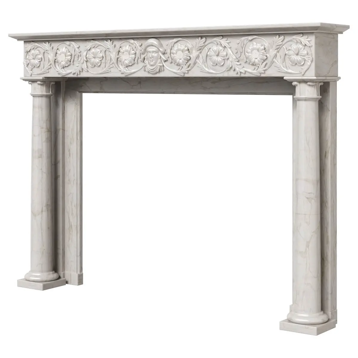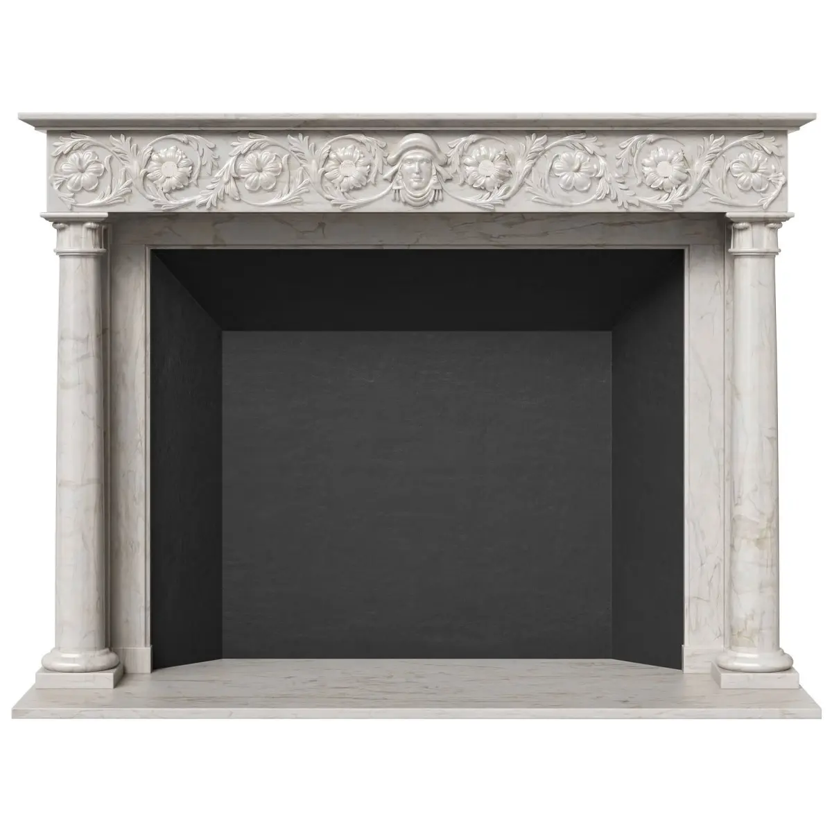 A high-quality antique Italian fireplace carved from sculptural marble. A running frieze with elegant carvings, decorated with sunflowers and foliage, with a female mask in the center. Round tapering columns with carved capitals, inverted acanthus leaves. The beginning of the 19th century. Although it belongs to the Italian category, it demonstrates many of the design qualities inherent in the period of the English regency.The model is assembled for subdivision. When using import formats, please apply MeshSmoth/TurboSmoth with 2-3 iterations.https://www.thornhillgalleries.co.uk/item/stock-number-3954/