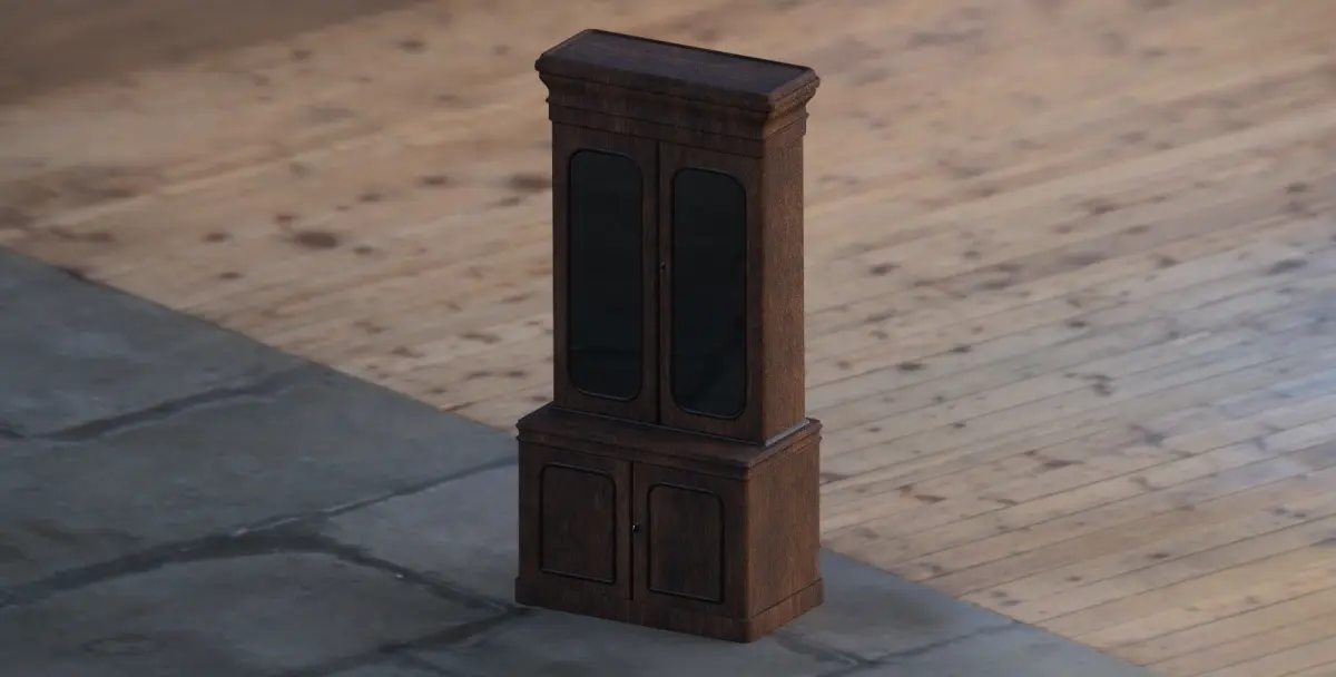 Model of Victorian, mahogany bookcase of unusual proportions, having moulded cornice above a pair of glazed doors enclosing 3 height adjustable shelves, projecting base with panelled flamed mahogany cupboard doors enclosing single height adjustable shelf, all standing on plinth base. Inside the model there are such details as shelves and books, a key and a keyhole.