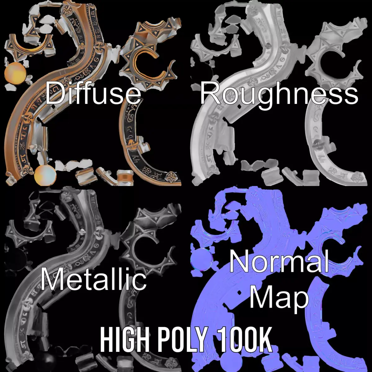 This Antique Compass Amulet model pack features an intricately designed compass amulet with a vintage aesthetic, perfect for historical or fantasy-themed projects. Each model has 3 levels of detail: low-poly (1000 triangles for mobile), middle-poly (10,000 triangles for environment), and high-poly (100,000 triangles), which allows for the use of this model in production rendering (such as 3ds Max, Maya, Cinema 4D, Blender, Vray/Corona/Cycles and all other), game engines (Unity and Unreal compatible), and interactive presentations, providing a choice of detail based on the LOD System principle. Its antique design makes it ideal for use in games involving treasure hunts, historical narratives, or fantasy scenarios where navigation tools are featured. The model's textures are PBR, Diffuse, NormalMap, and reflection/roughness/metallic, suitable for any modern rendering engine. All models accurately unwrapped and have no overlapping UV. All textures are 4096*4096 in size.