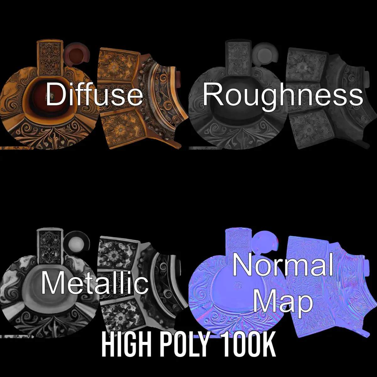 This Antique Decorative Bottle Model Pack offers a stunningly detailed representation of an intricately designed bottle. Each model has 3 levels of detail: low-poly (1000 triangles for mobile), middle-poly (10,000 triangles for environment), and high-poly (100,000 triangles), which allows for the use of this model in production rendering (such as 3ds Max, Maya, Cinema4D, Blender, Vray/Corona/Cycles and all other), game engines (Unity and Unreal compatible), and interactive presentations, providing a choice of detail based on the LOD System principle. Perfect for historical scene recreations, film props, and virtual museum exhibits. The model's textures are PBR, Diffuse, NormalMap, and reflection/roughness/metallic, which are suitable for any modern rendering engine. All models are accurately unwrapped and have no overlapping UV. All textures are 4096*4096 in size.