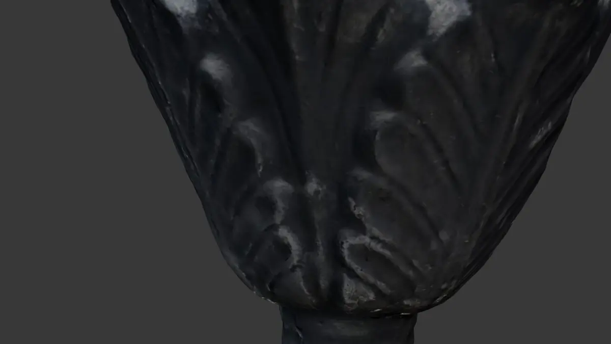 High-quality 3D scan of an antique decorative vase with a floral-inspired design. This detailed scan captures the aged surface, intricate sculptural details, and realistic textures, making it ideal for CGI, architectural visualization, historical reconstructions, game assets, and 3D printing.
