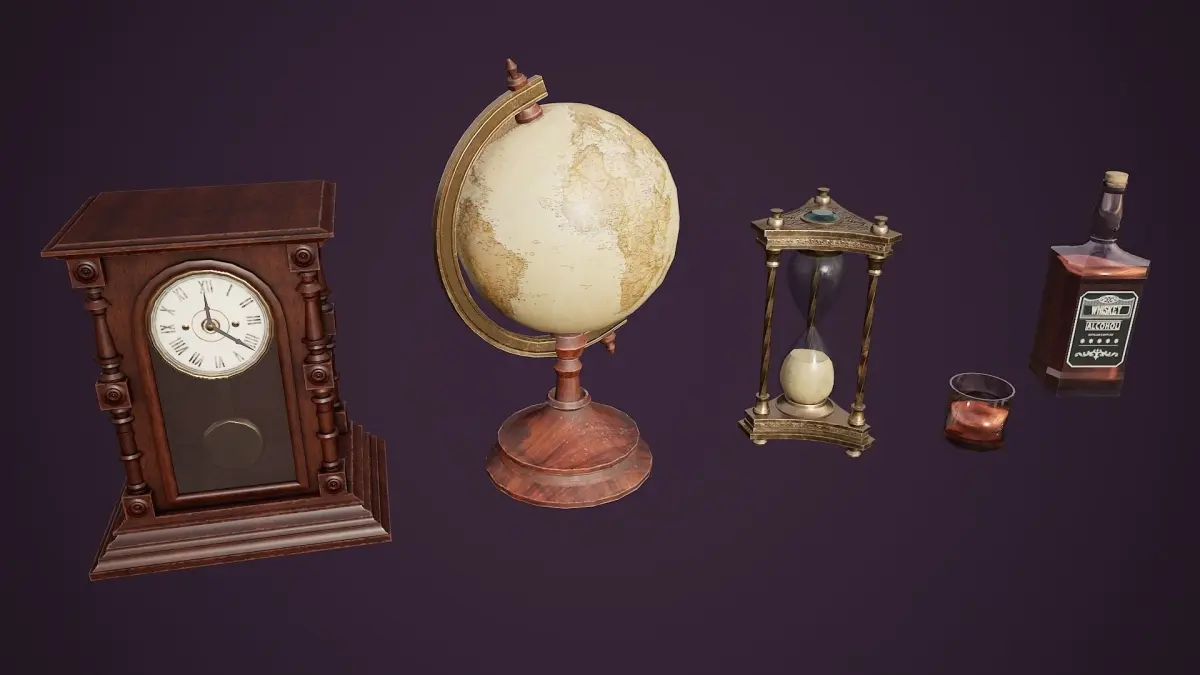 Pack of twenty seven detailed PBR gameready 3d models of antique chair and desk with the miscellaneous. These models can be used as the props or parts of environment in an FPS game / third-person game - such as a shooter, RPG, etc. The pack includes the following 3D models - table, chair, hourglass, typewrite, clock, globe, casket, lamp, whiskey bootle and glass, nine books and various papers.