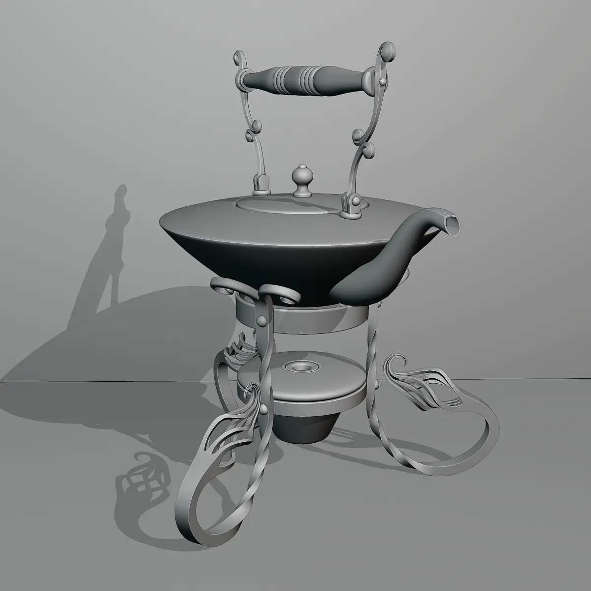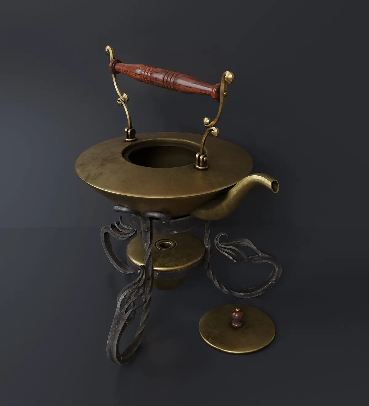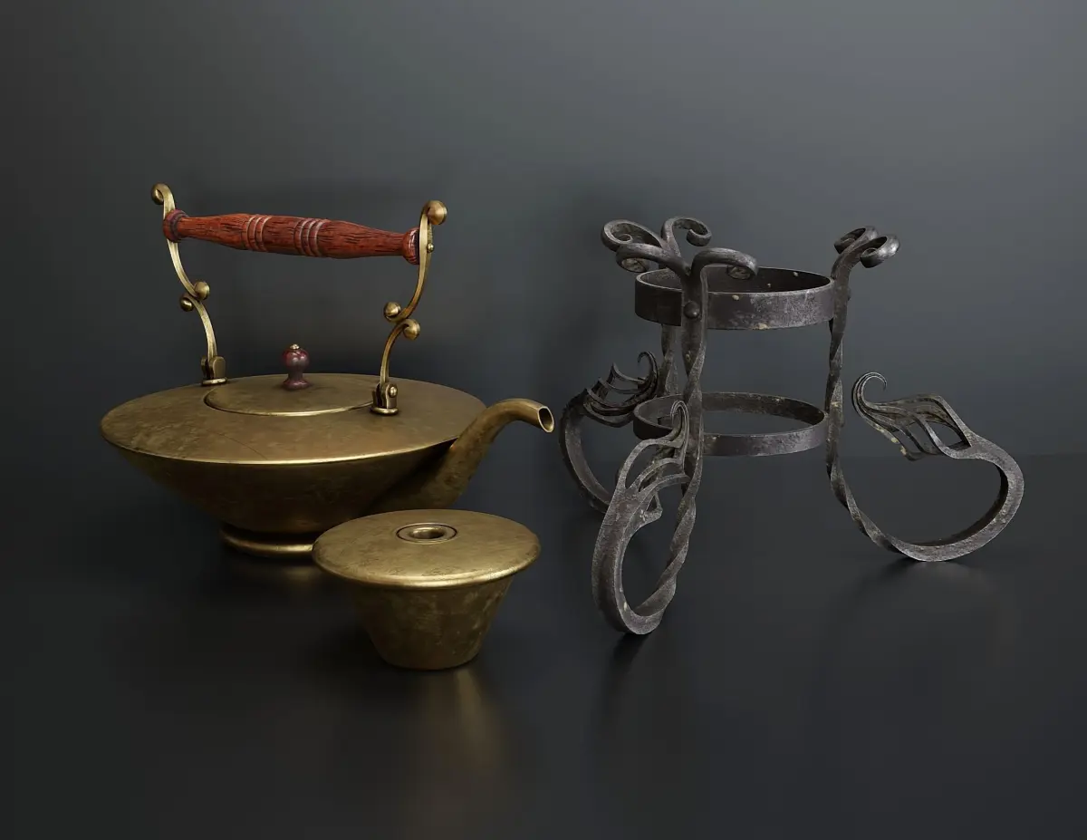 A tea set.England 19th century.Brass, forging.The model consists of several objects: a teapot with a removable lid, a teapot handle, a burner and a stand. All textures (res. 4096x4096) were baked in Substance Painter and packed in a zip archive.