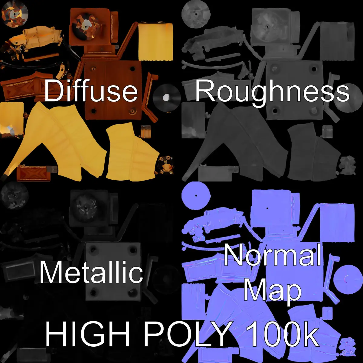 This Antique Gramophone Model Pack features highly detailed 3D models suitable for various applications, including production rendering and interactive presentations. The pack contains models with three levels of detail: low-poly for mobile (1000 triangles), middle-poly for environment (10,000 triangles), and high-poly for high-quality renders (100,000 triangles). The PBR textures include Diffuse, NormalMap, and reflection/roughness/metallic, all in 4096*4096 resolution, ensuring suitability for modern rendering engines. Perfect for historical animations, vintage-themed games, and virtual museums. Models are accurately unwrapped with no overlapping UVs. Please like and leave a comment if you enjoy this model. The first image is the reference used for creating the 3D model. It is important to carefully evaluate the quality of the model by examining the preview images that display the topology and polygonal mesh. These previews (WIRE and WEB 3D Preview) clearly demonstrate how accurately the model matches the original reference and how well the geometry has been executed.