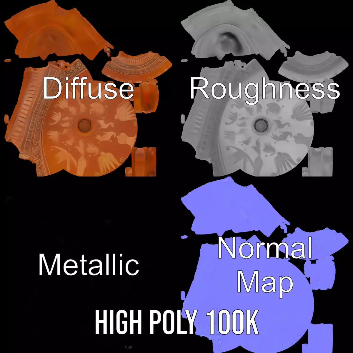 This Antique Greek Vase model pack captures the elegance of traditional Greek pottery with intricate designs and a classic terracotta finish. Ideal for historical scenes, museums, or educational media. Each model has 3 levels of detail: low-poly (1000 triangles for mobile), middle-poly (10,000 triangles for environment), and high-poly (100,000 triangles), which allows for the use of this model in production rendering (such as 3ds Max, Maya, Cinema 4D, Blender, Vray/Corona/Cycles and all other), game engines (Unity and Unreal compatible), and interactive presentations, providing a choice of detail based on the LOD System principle. The model's textures are PBR, Diffuse, NormalMap, and reflection/roughness/metallic, suitable for any modern rendering engine. All models are accurately unwrapped and have no overlapping UV. All textures are 4096*4096 in size. If you like the model, please leave a like and comment.