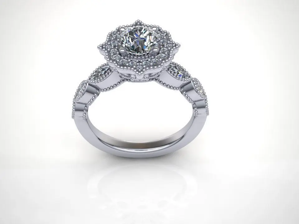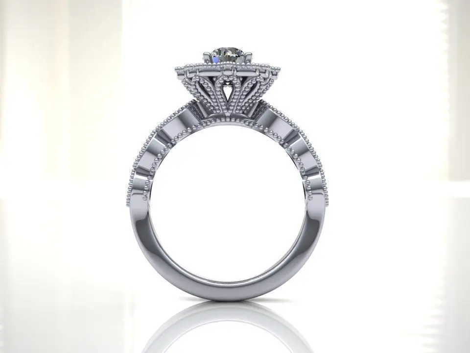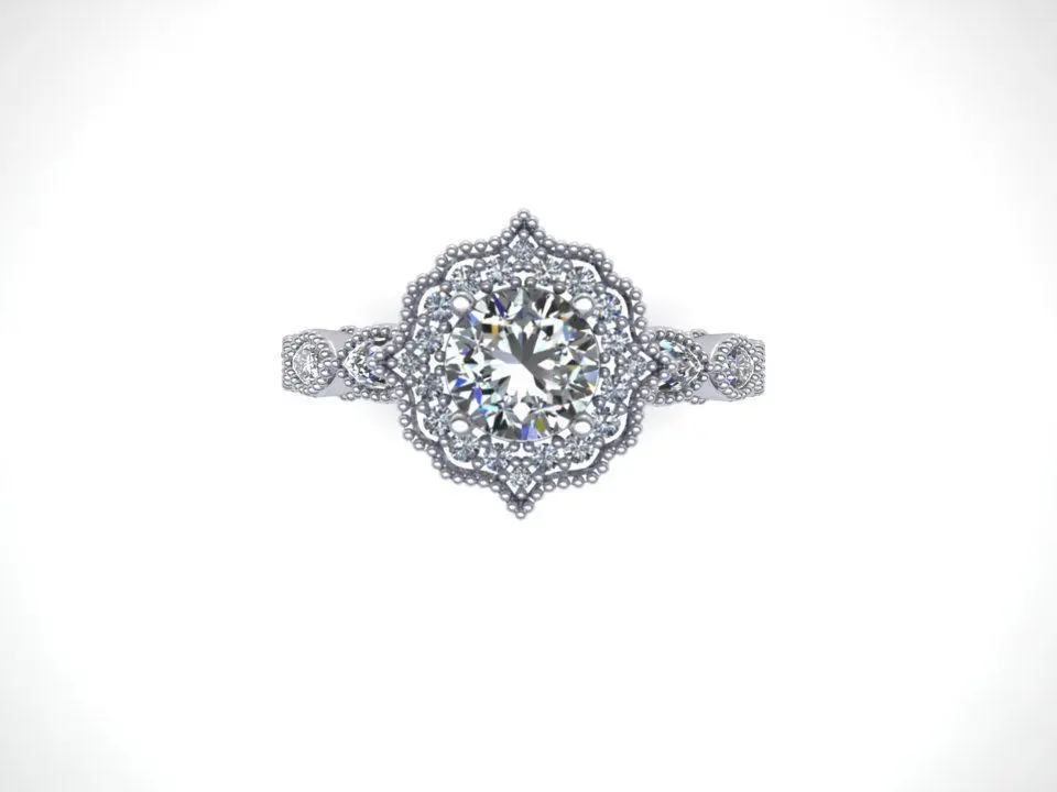 Beautiful, vintage - inspired halo ring with marquise down the shank. F/S 5 but sizing in CAD available upon request. Center is a 5mm RBC but able to fit a 1ct center. This beauty was designed with Matrixv9 Jewelry CAD software by an expert jewelry designer with manufacturing experience.