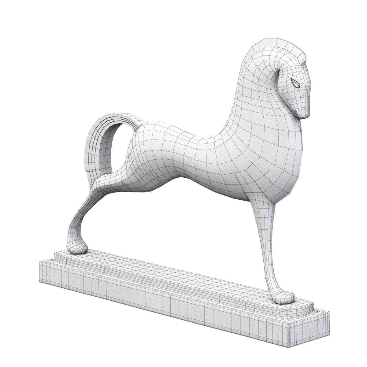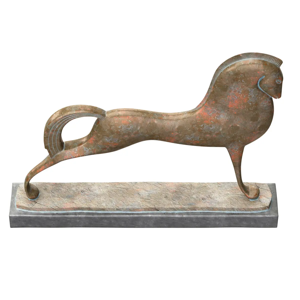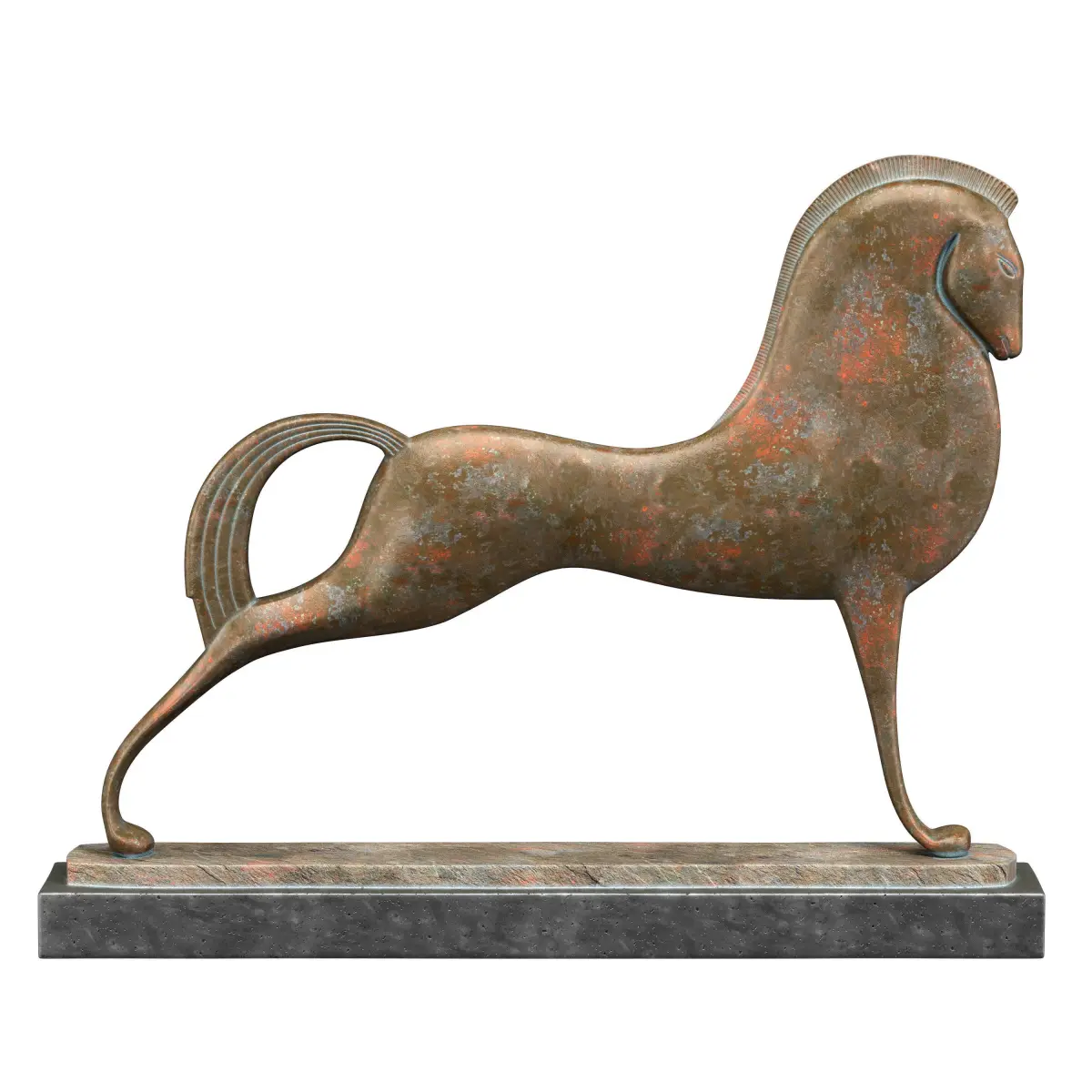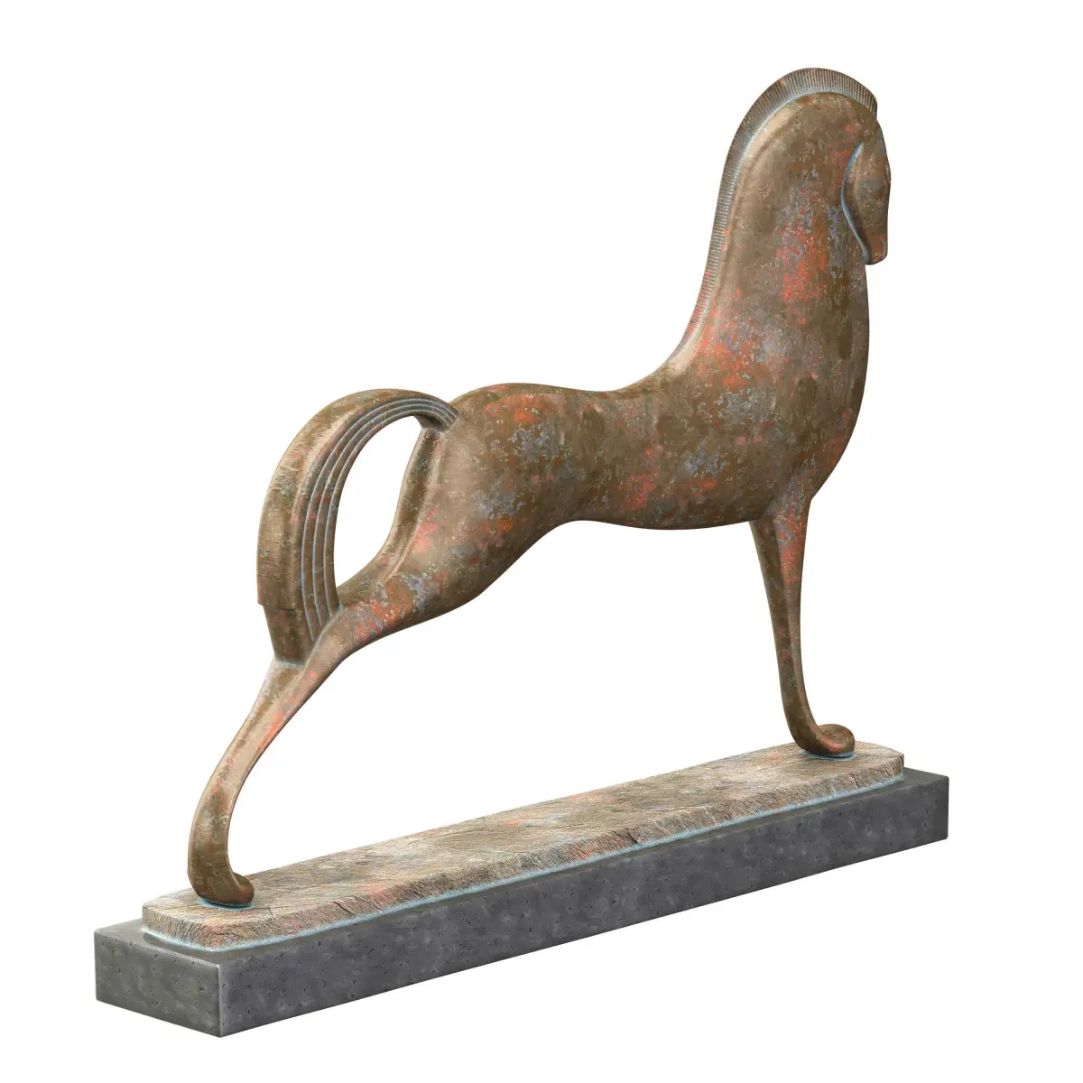 Etruscan style horse sculpture finished in a copper bronze with light gray glaze and set atop an aged matte black base.