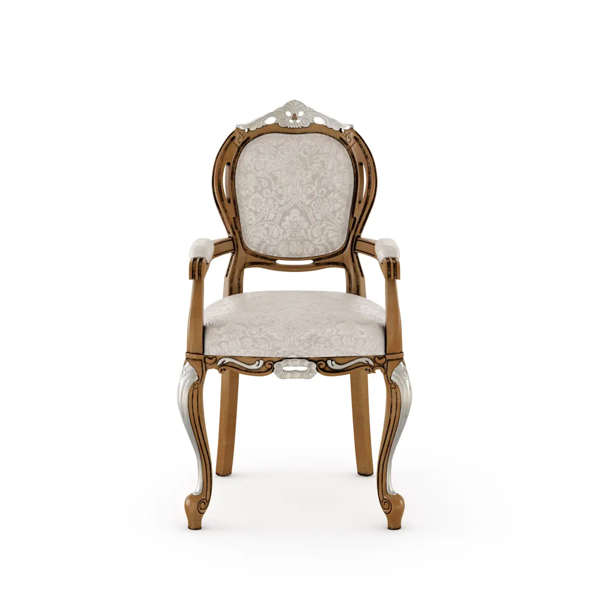 This Antique Ivory Brocade Armchair exudes a timeless sophistication that seamlessly bridges the gap between classic charm and contemporary comfort. Crafted with a passion for detail, the chair features a polished wooden frame with a deep, rich finish that highlights the natural beauty of the wood. Elegant curves and flowing lines are accentuated by the subtle metallic sheen of silver-leaf accents, which complement the chair's overall muted palette.