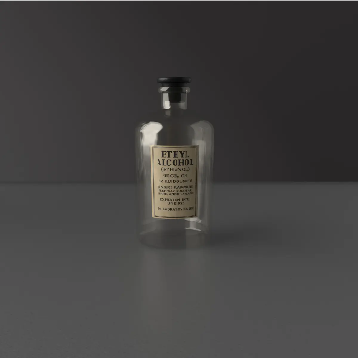 This model represents a classic laboratory setup used for the process of distillation—featuring a glass boiling flask, spiral condenser, and metal heating element, all mounted on an aged metallic stand. An additional glass bottle labeled Ethyl Alcohol and a sculpted spoon add to the realism and storytelling potential of the scene.