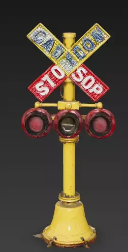 Mechanical X Blades The top section features two crossed rectangular blades. The yellow blade reads CAUTION and the red blade reads STOP. The letters are designed to look like they are filled with small glass marbles (cat's eye reflectors) to catch headlight beams at night.